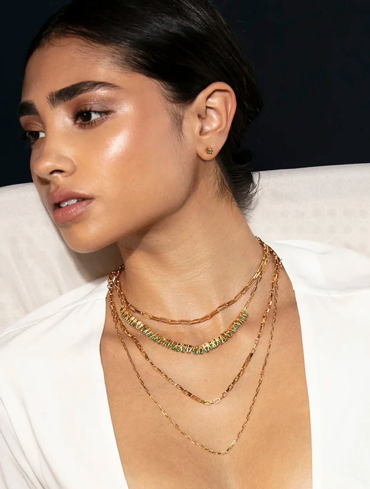 Topos con engaste de esmeralda en bruto colombiana, delicados y perfectos para el día a día, hechos a mano en bronce con baño de oro de 24 quilates.