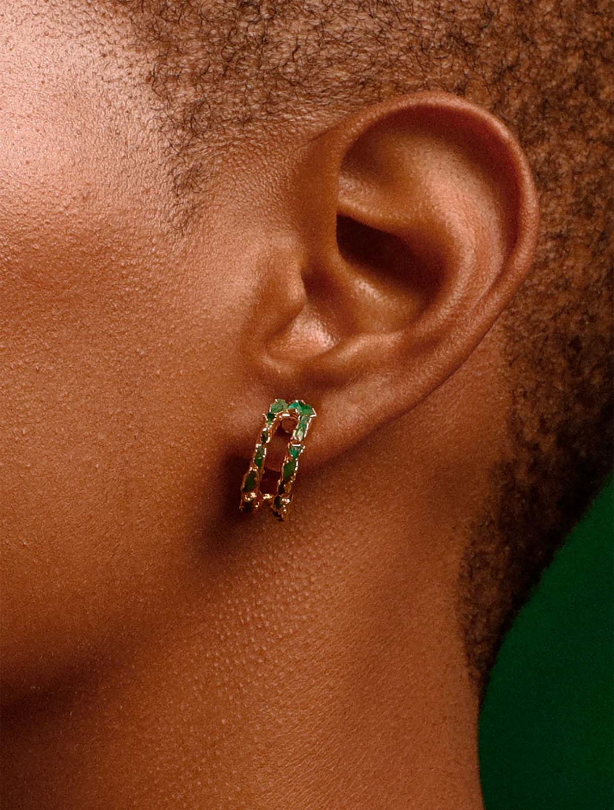 Aretes tipo candonga en bronce con baño en oro de 24k, electro formadas con múltiples esmeraldas en bruto colombianas.