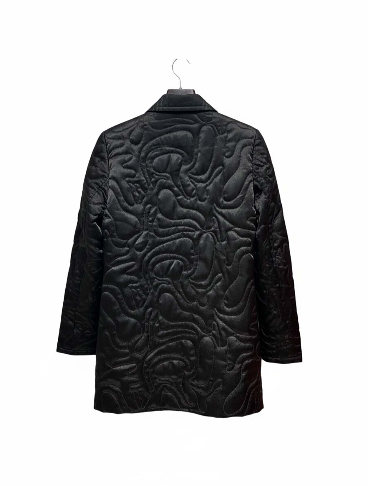Blazer de corte semilargo con solapa de muesca clásica y cierre frontal de un solo botón. El diseño es la característica principal, ya que la tela es acolchada con un patrón texturizado y orgánico (posiblemente floral o abstracto) en toda la superficie. Bolsillos frontales de ojal con solapa. Forro interior estampado.