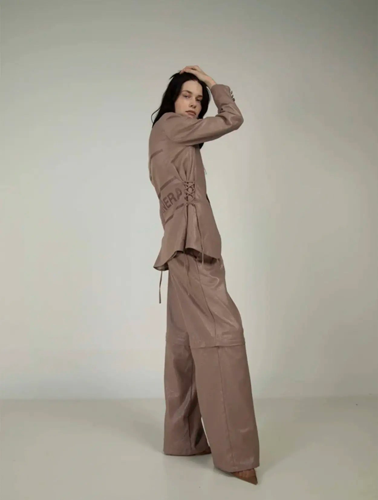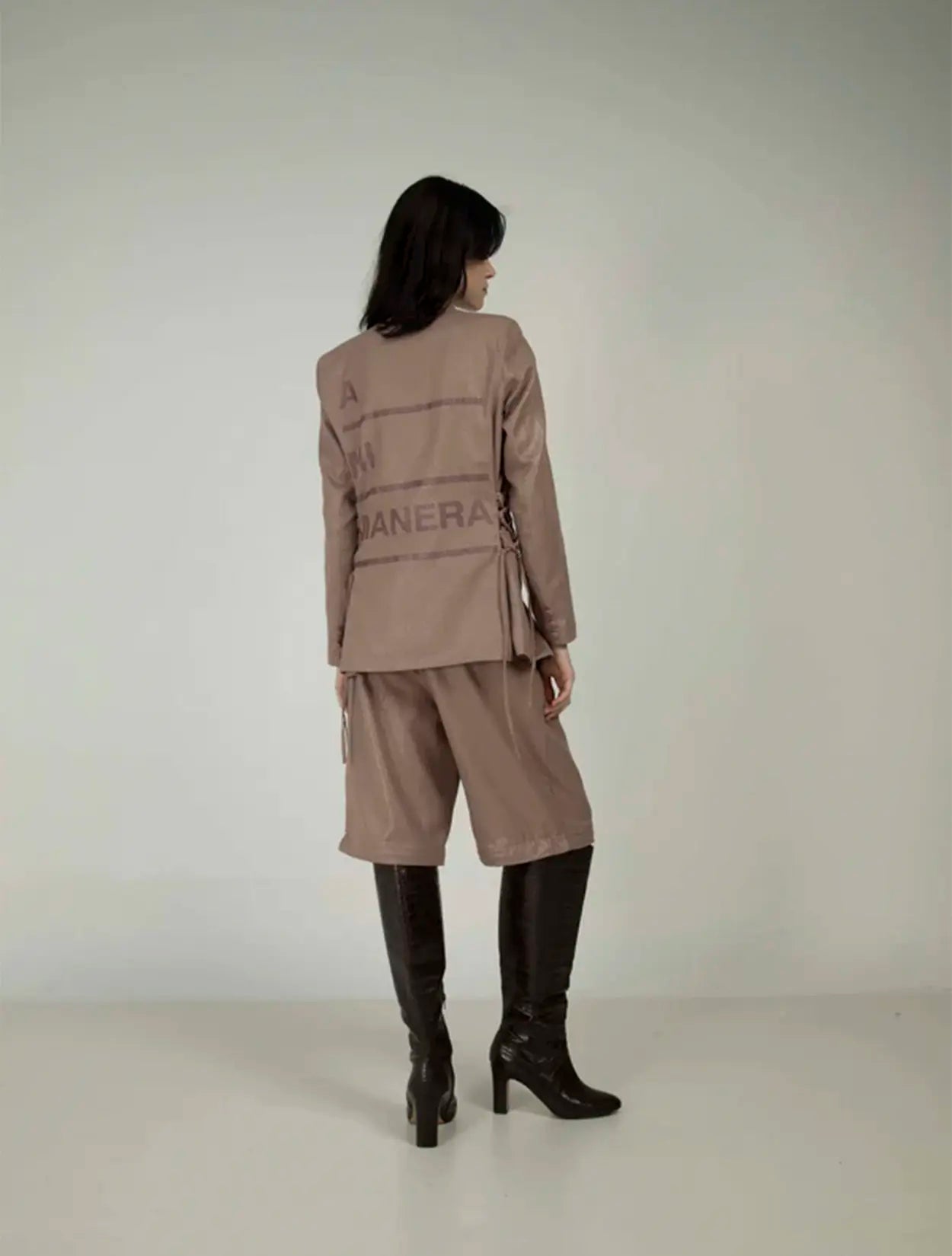 Blazer cuello solapa de lino con efecto sirena, "A MI MANERA" estampado en la espalda, costados con mirellas, bolsillos delanteros con tapa y botón como sistema de cierre.