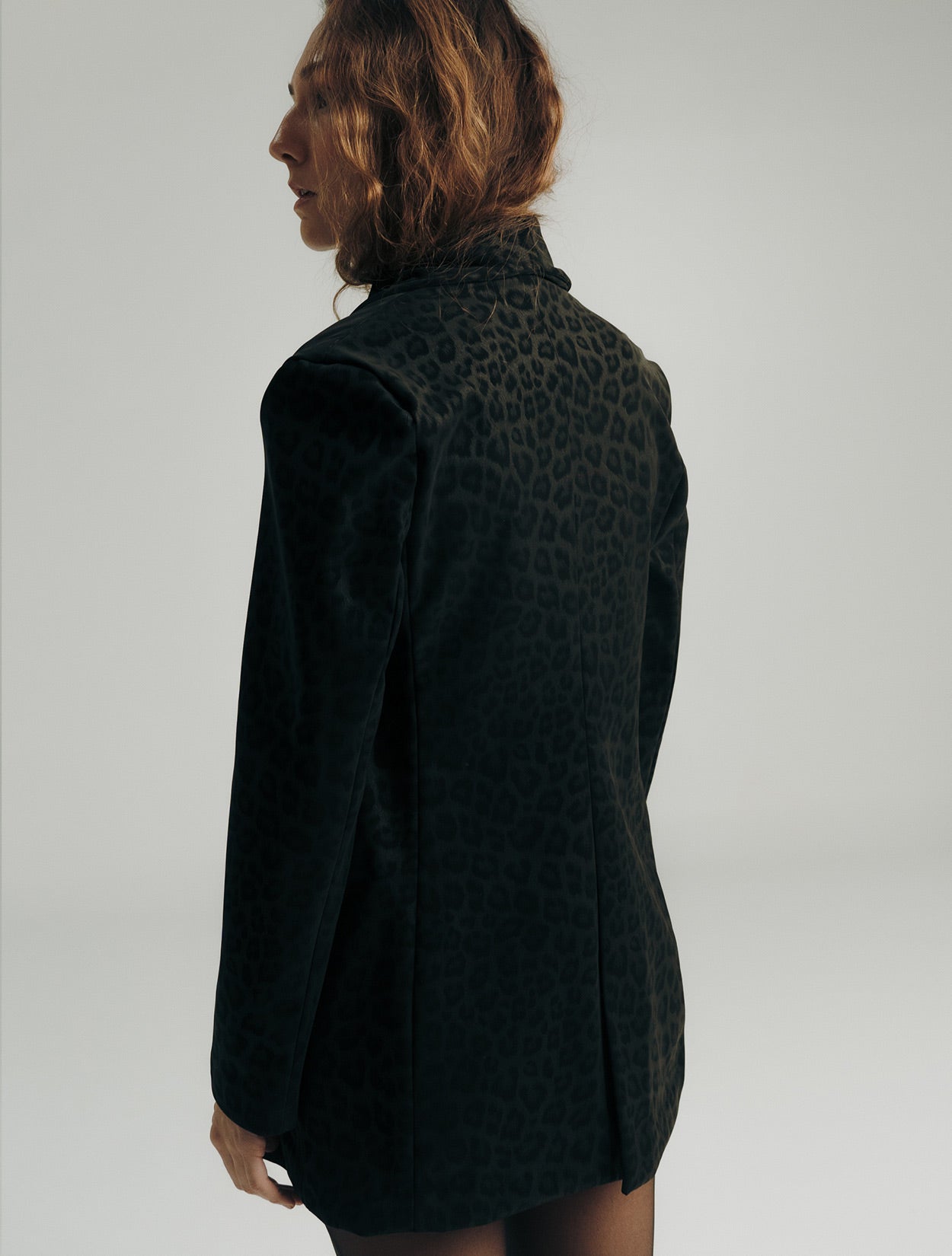 Blazer cruzado de fit oversize. Incorpora hombreras para aportar estructura a la silueta. Blazer de tela gruesa con tacto gamuzado y estampado de leopardo e interior afelpado. No lleva forro.