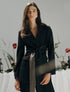 Blazer en paño ligero con textura. De corte largo hasta debajo de la cadera, incorpora cinturón en la cintura como parte del diseño.