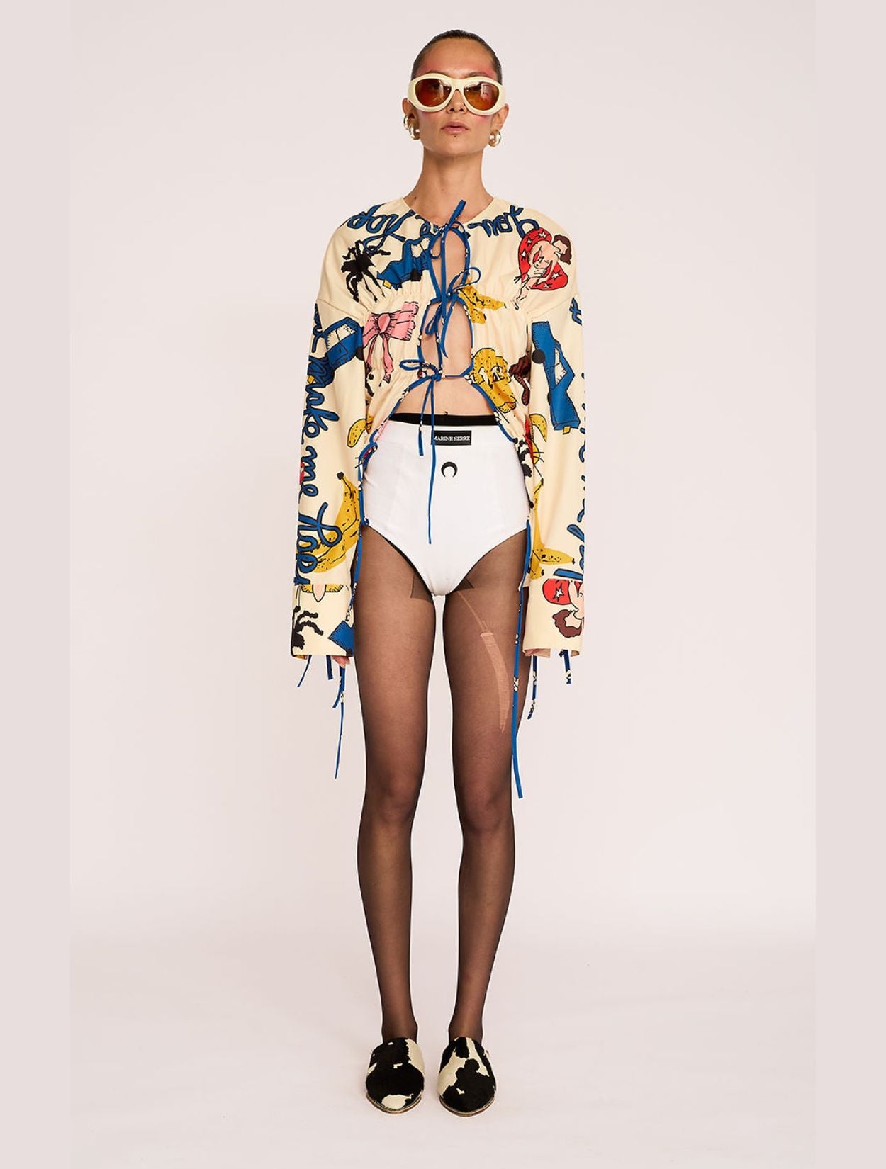 Blusa cropped de estilo open-front con mangas largas y holgadas que se recogen en puños. El diseño más destacado son los lazos frontales de color azul que permiten ajustar la abertura. El patrón es un llamativo estampado gráfico de estilo cartoon con textos y figuras abstractas.