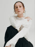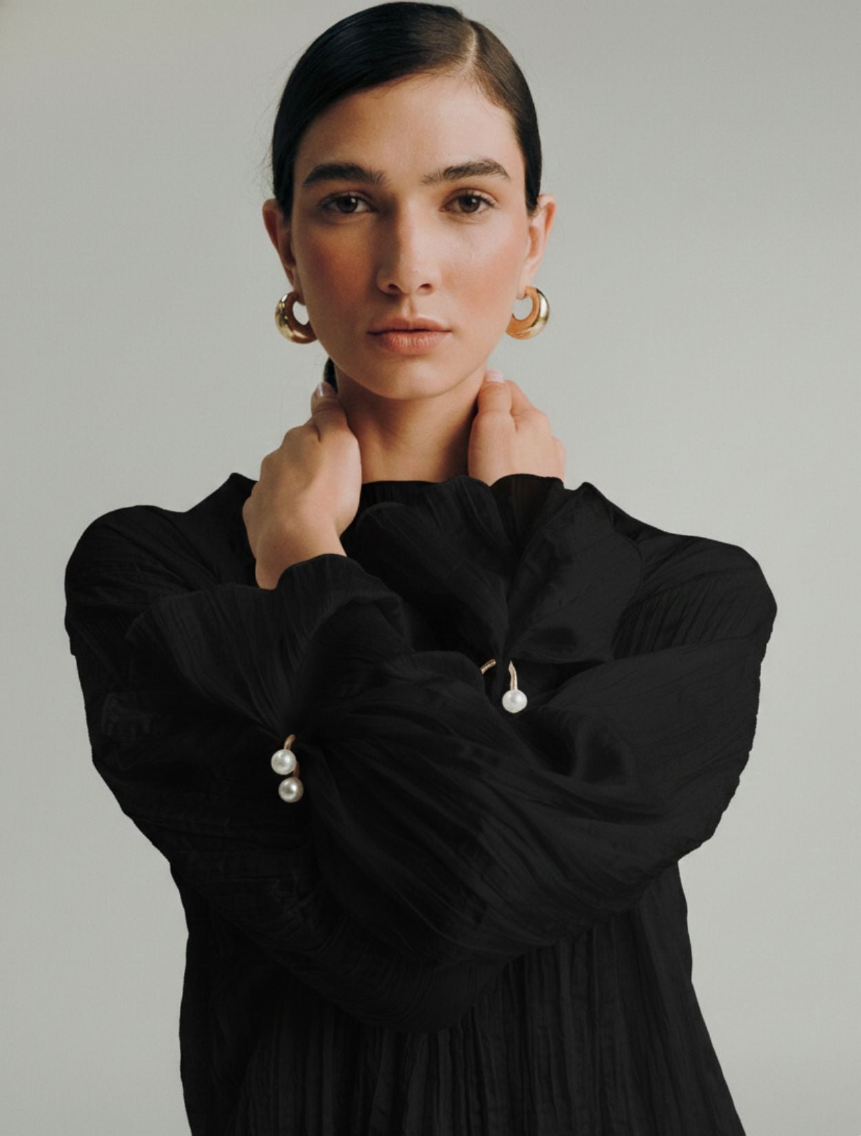 Blusa de escote redondo, confeccionada en tela plisada. De largo medio a la cadera con cintura recta. Mangas amplias con detalle de perla que entuba suavemente el puño.