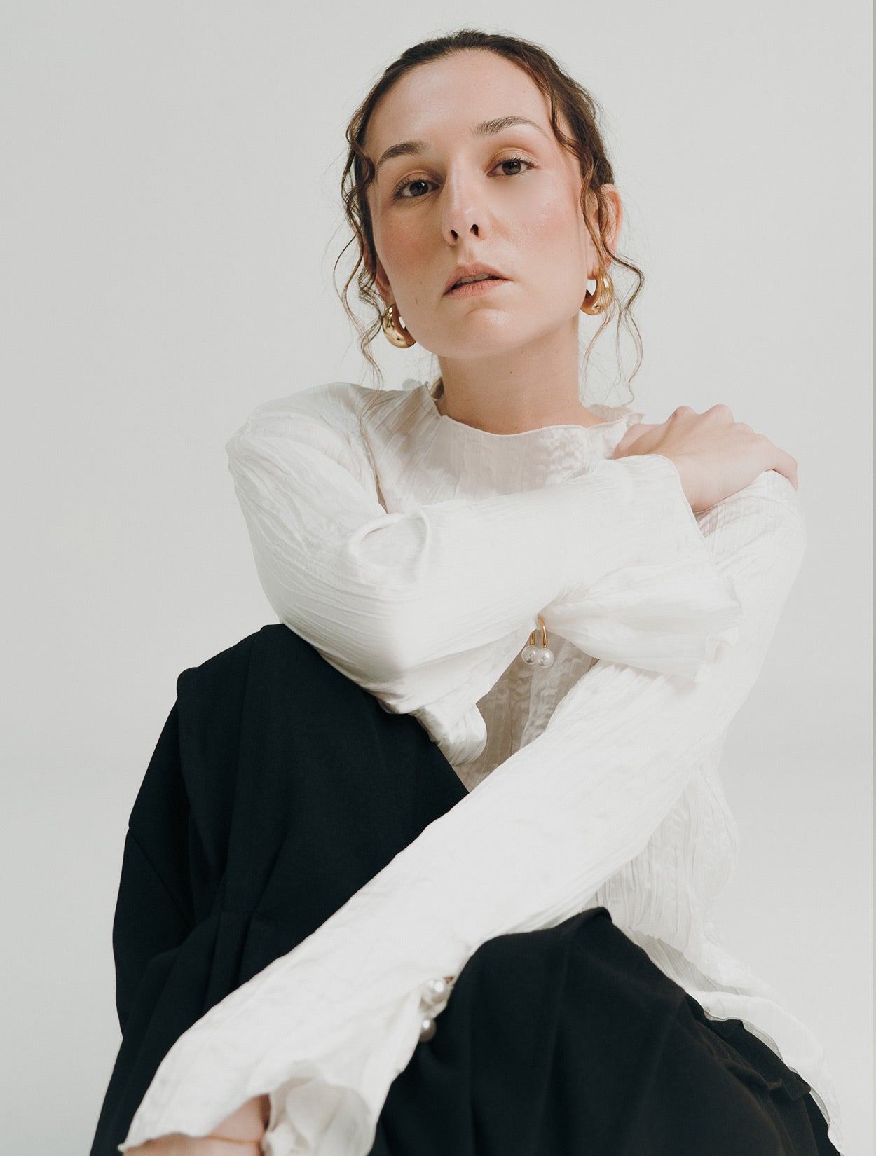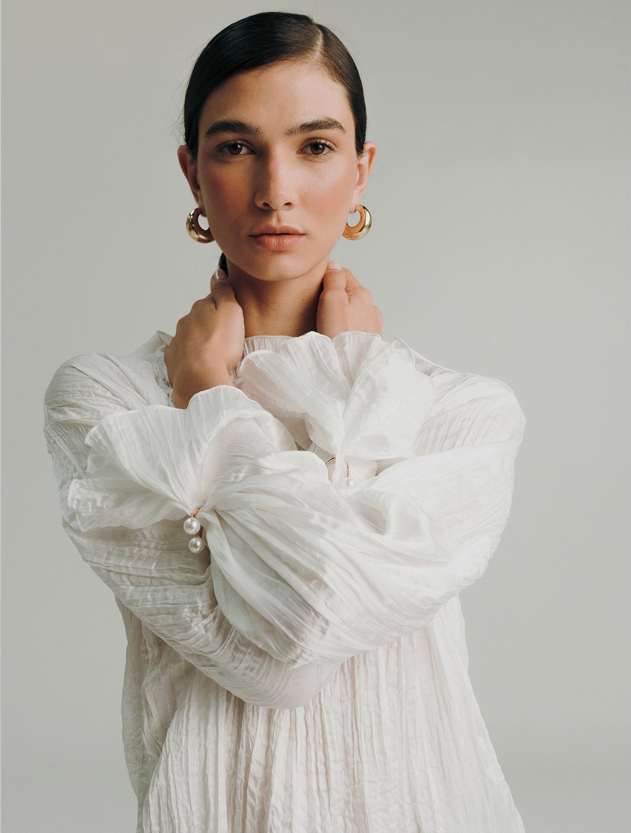 Fit: Silueta suelta con caída ligera. El plisado da estructura sin rigidez y las mangas amplias aportan movimiento.