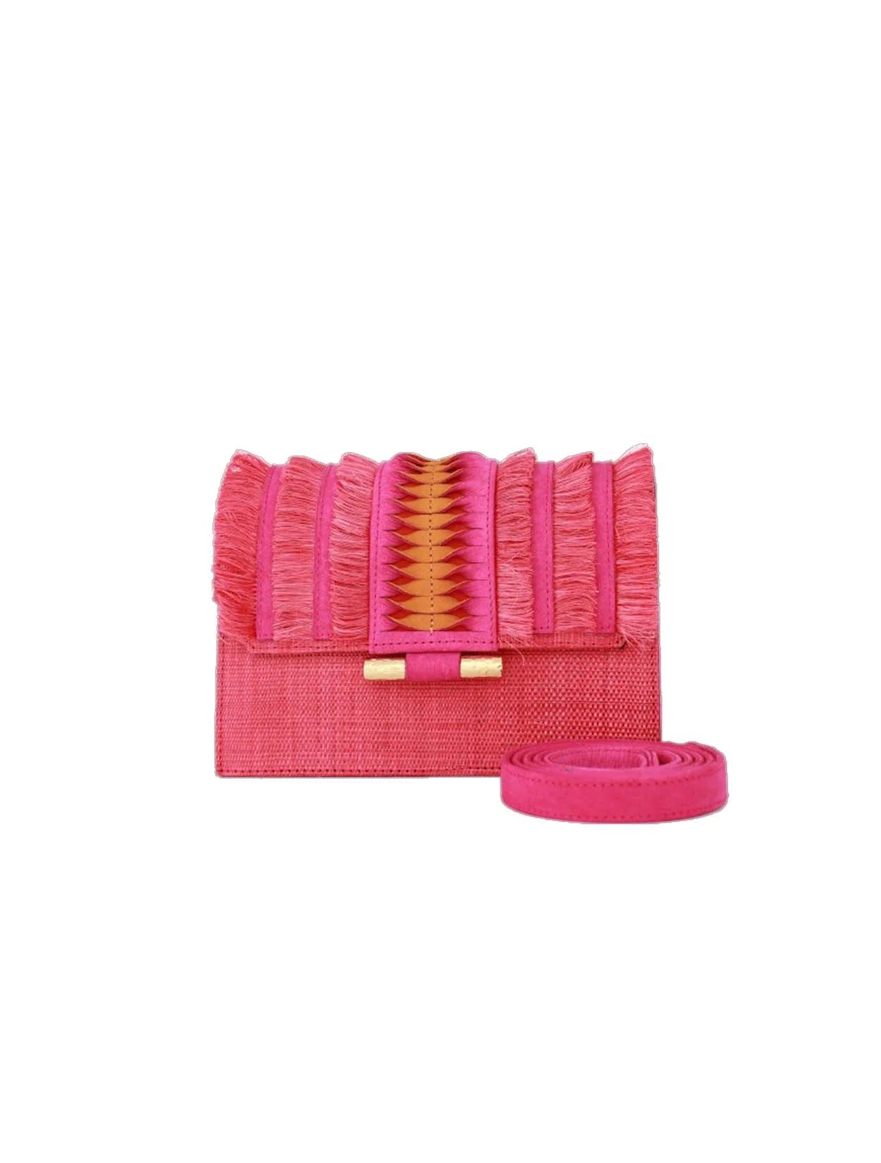 Bolso de mano artesanal con un impactante color fucsia intenso destaca por su textura única y su solapa adornada con flecos y un tejido étnico en tonos dorados y anaranjados.