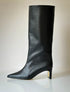 Botas de caña alta elaboradas en cuero negro con tacón grueso.