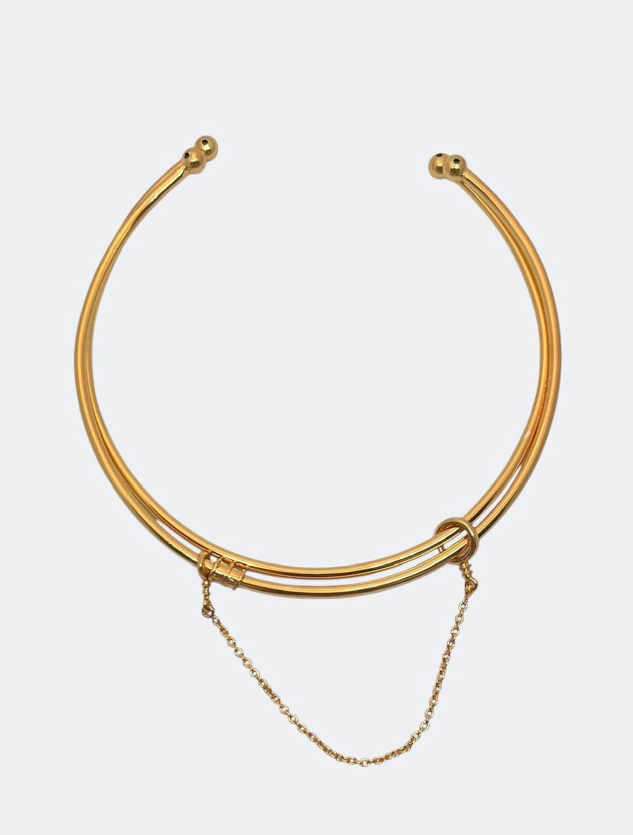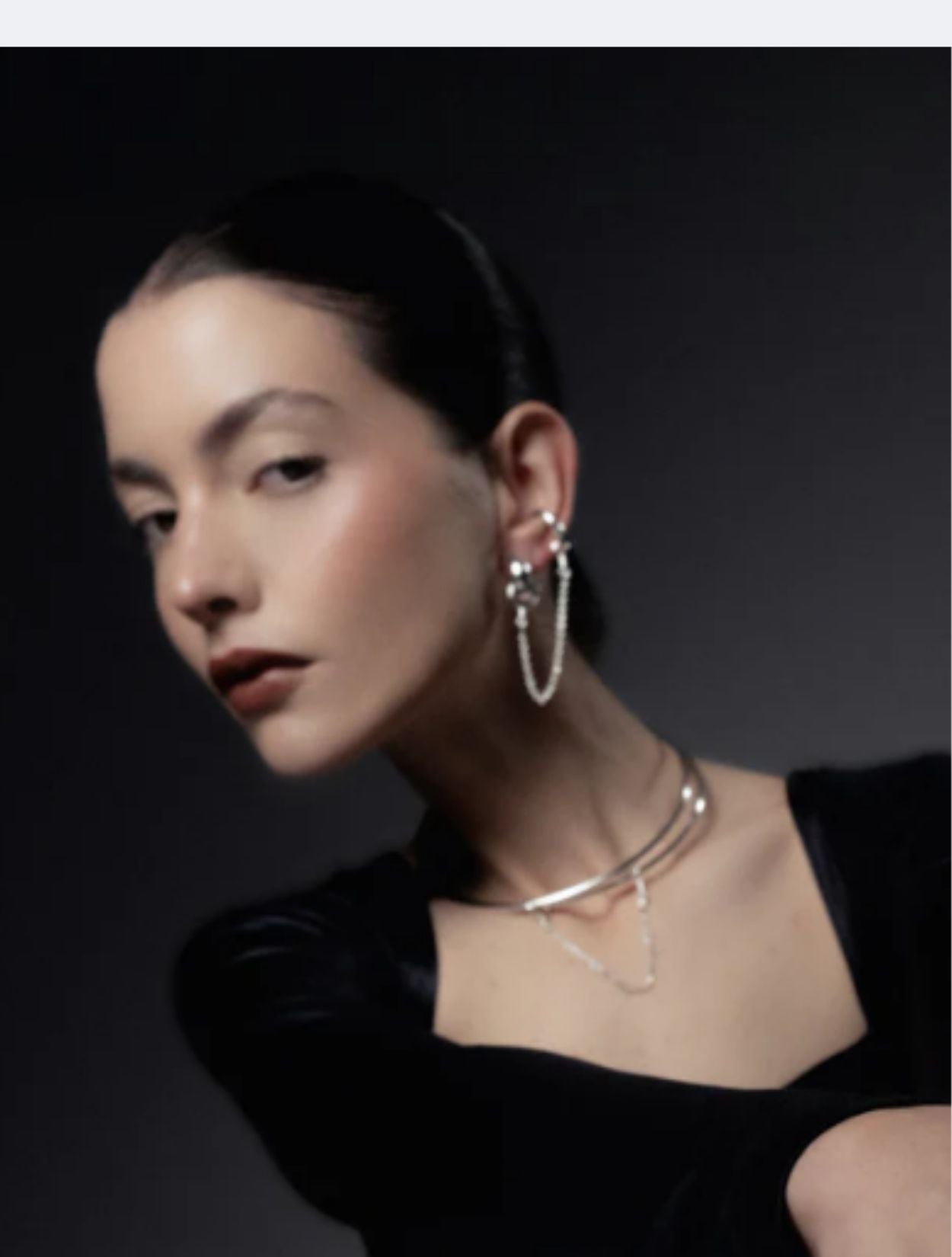 Una pieza de alta orfebrería que redefine la sofisticación. Esta gargantilla presenta un diseño semirrígido, pulcro y abierto, adornado con una sutil cadena de caída delicada que aporta movimiento y distinción al escote.