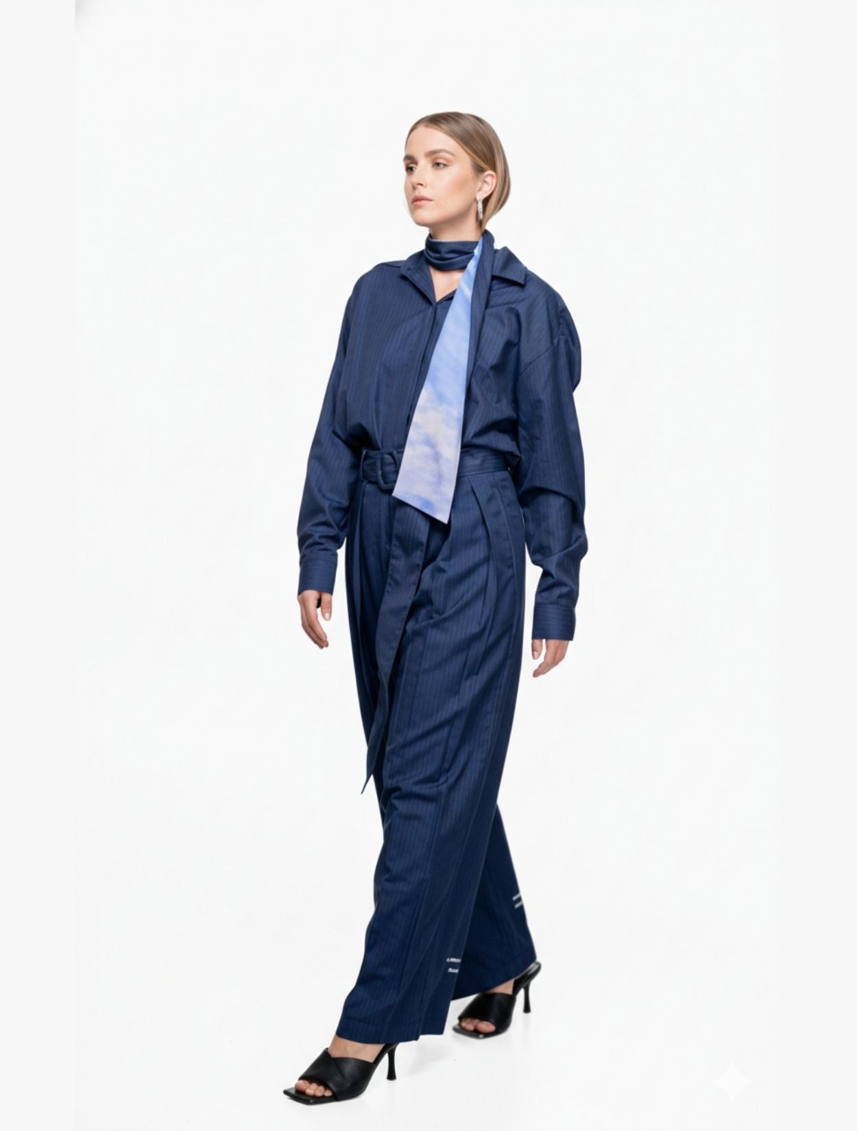 La camisa muestra un corte oversize de hombros caídos que genera un volumen relajado en el torso, equilibrado por un cinturón ancho forrado con hebilla circular que redefine la estructura de la prenda en la cintura.