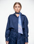 Está confeccionada en un tejido con textura de microrraya vertical, lo que aporta profundidad visual al tono azul sólido. Incluye puños anchos bien definidos y una botonadura frontal oculta que mantiene la limpieza del diseño.