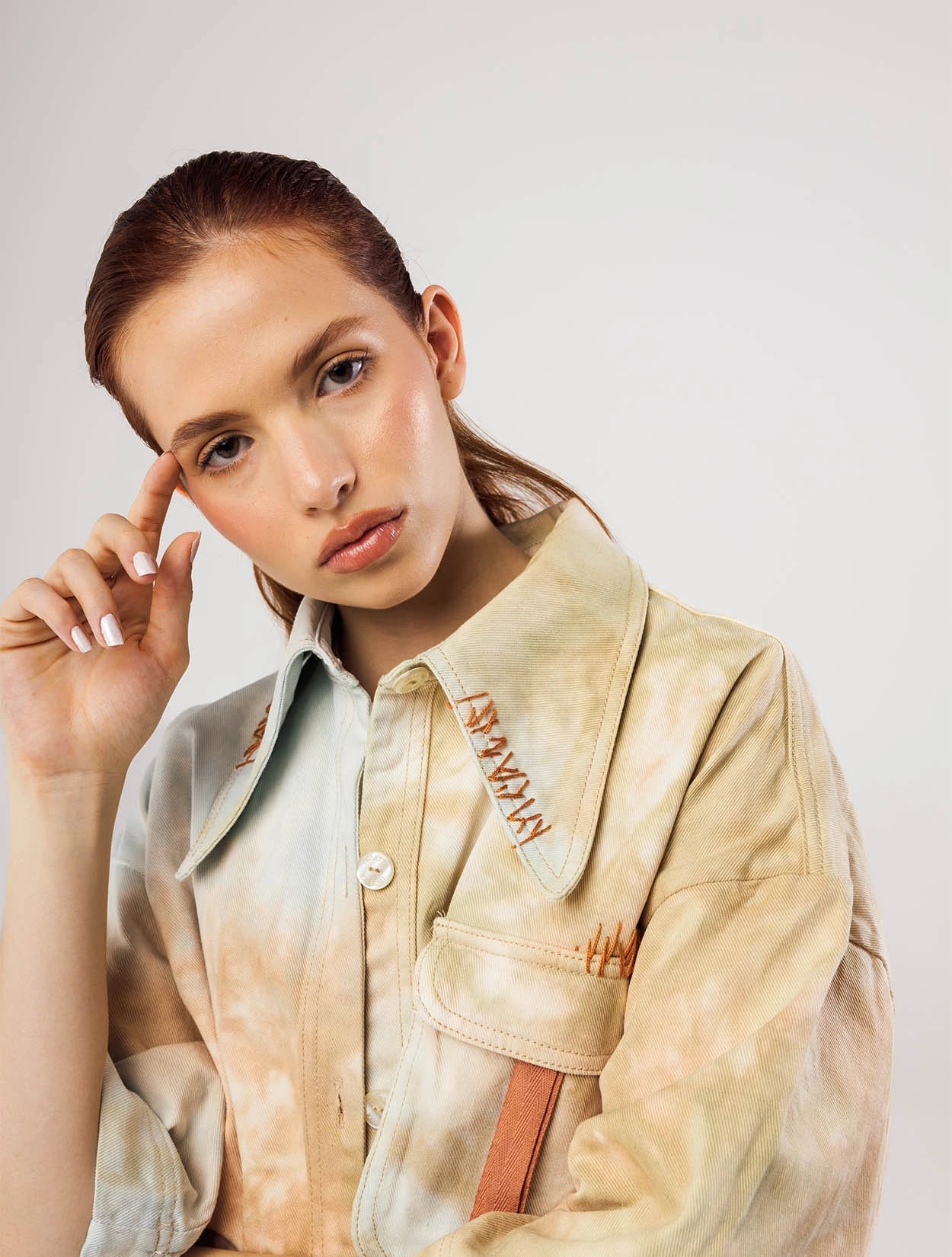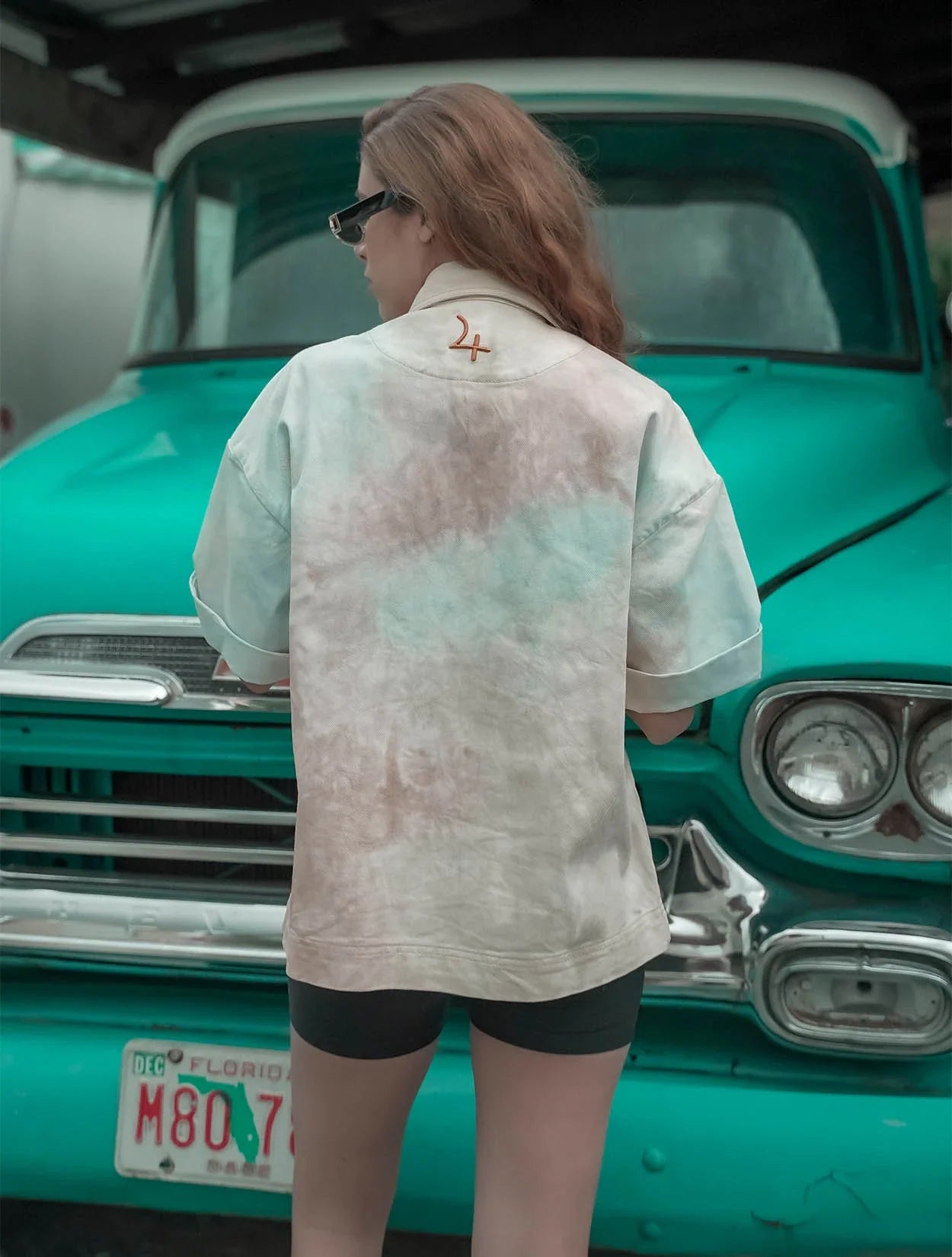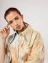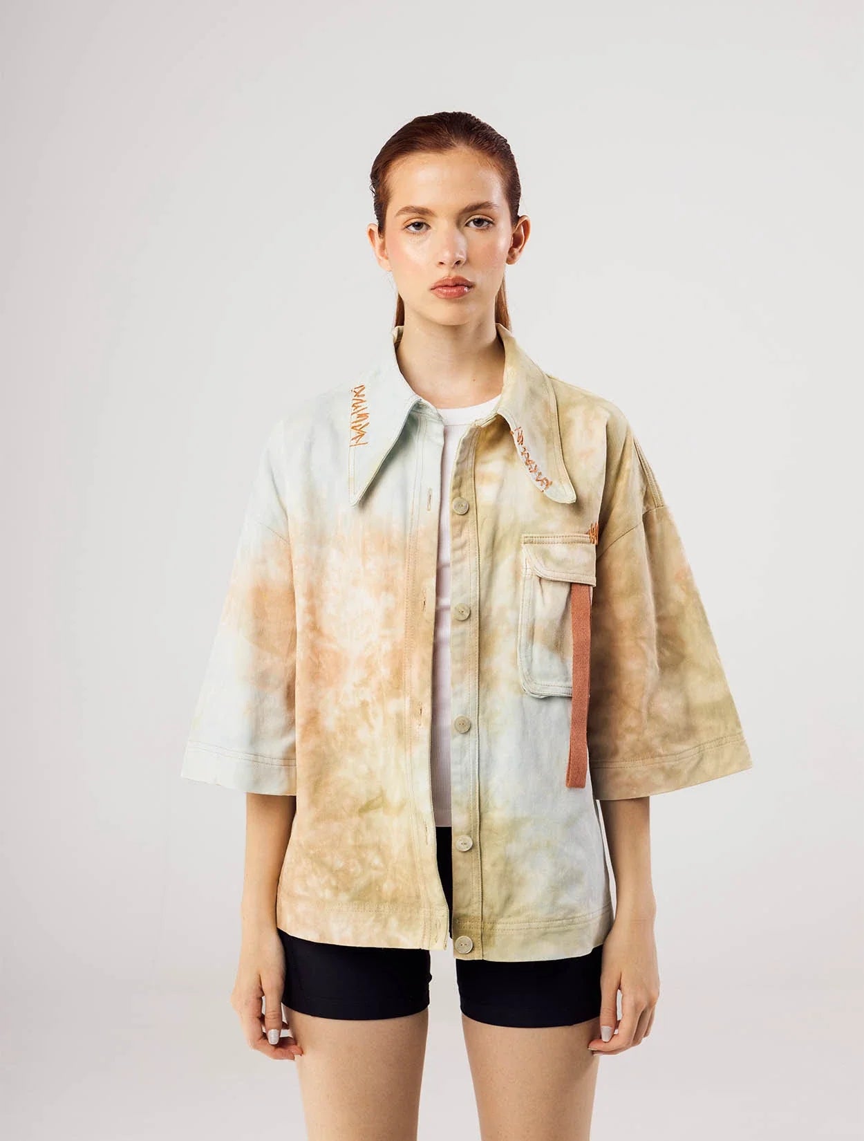 Una camisa teñida artesanalmente con técnica Ice dye y bordada tanto en la espalda con el signo del planeta, como en su frente con puntadas a mano. La hiladilla y la forma del cuello le dan un toque de singularidad y exclusividad.