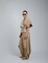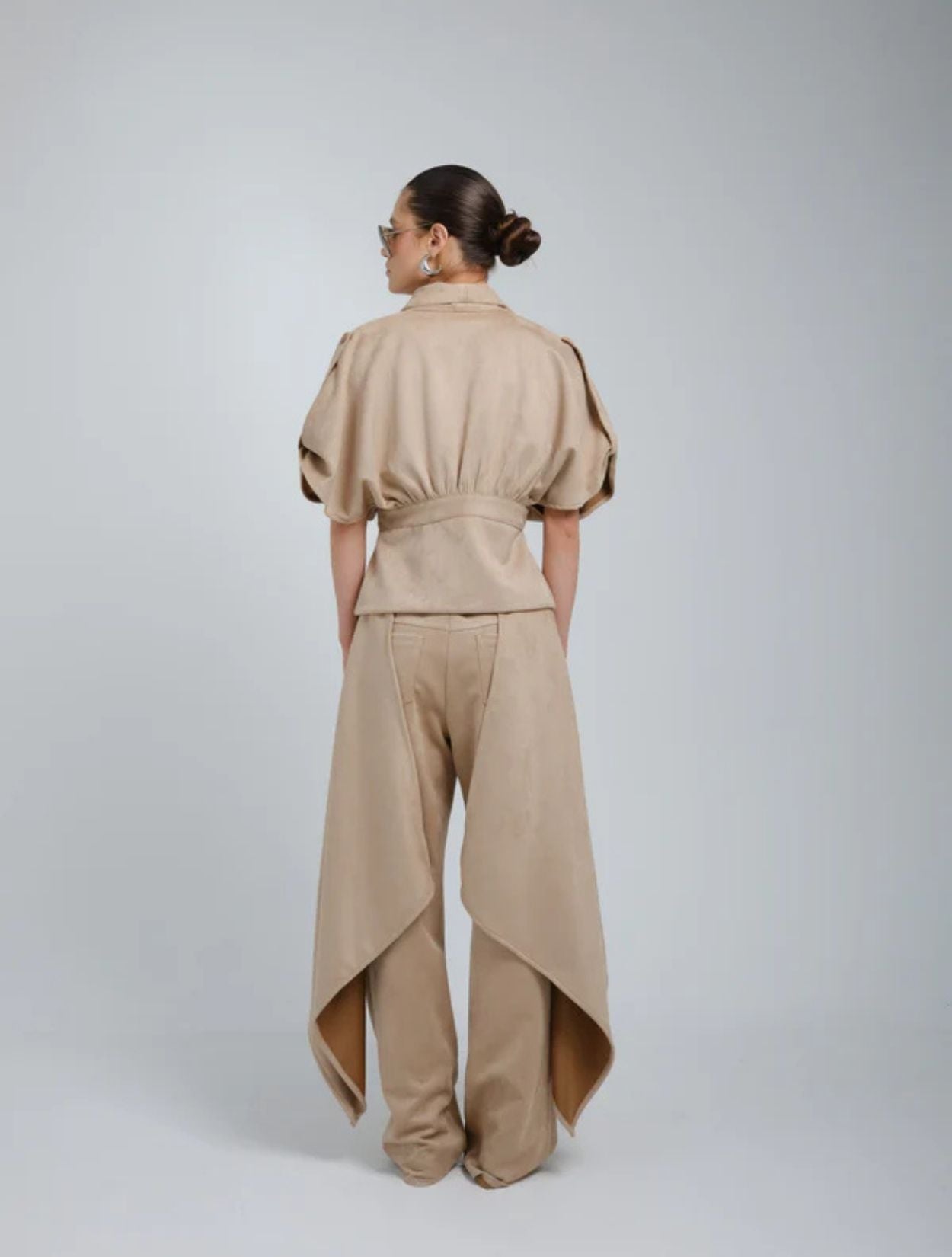 Camisa oversized en gamusa beige, asimetrica, con manga caida, cuello grande, entallada en cintura, con botón como sistema de cierre.