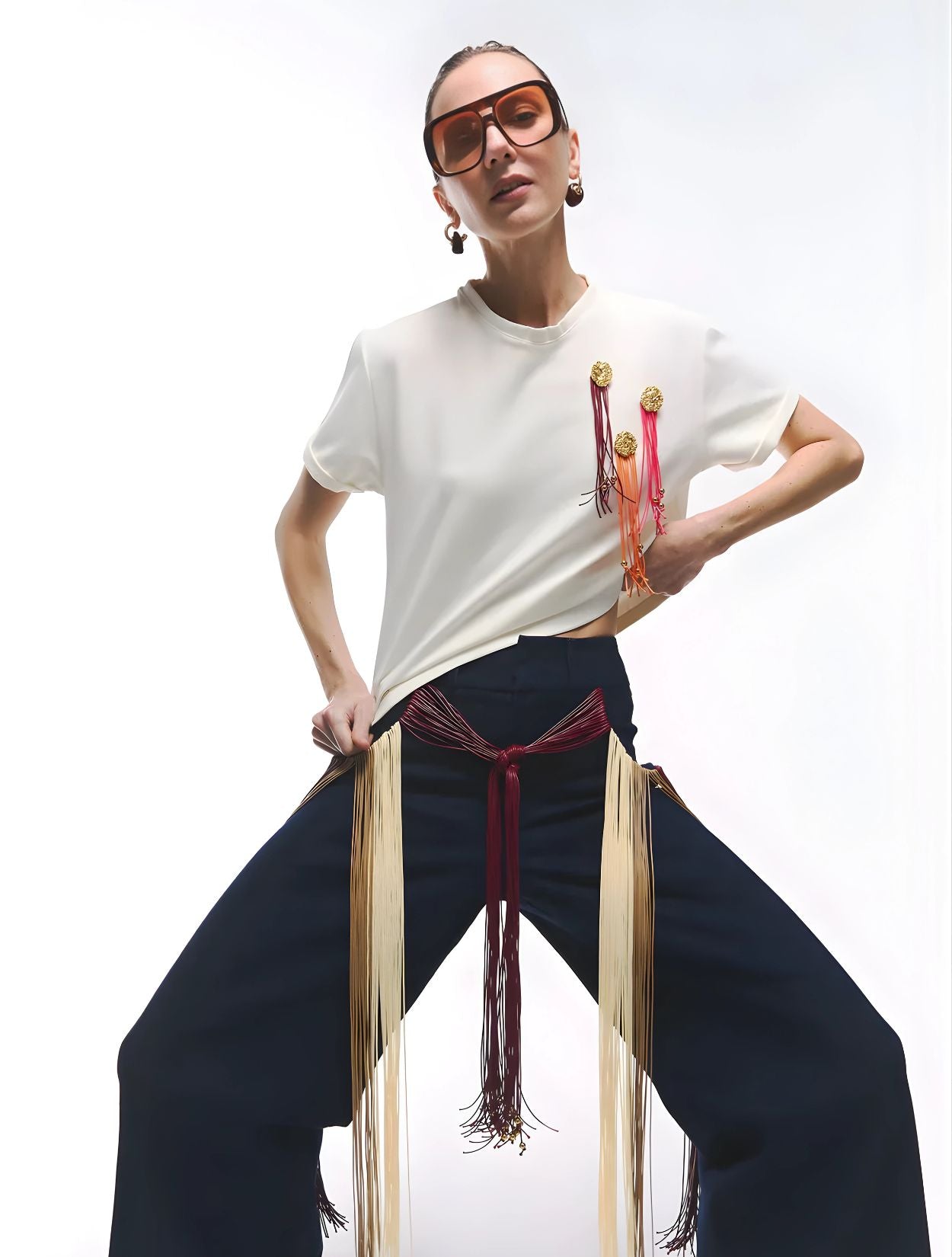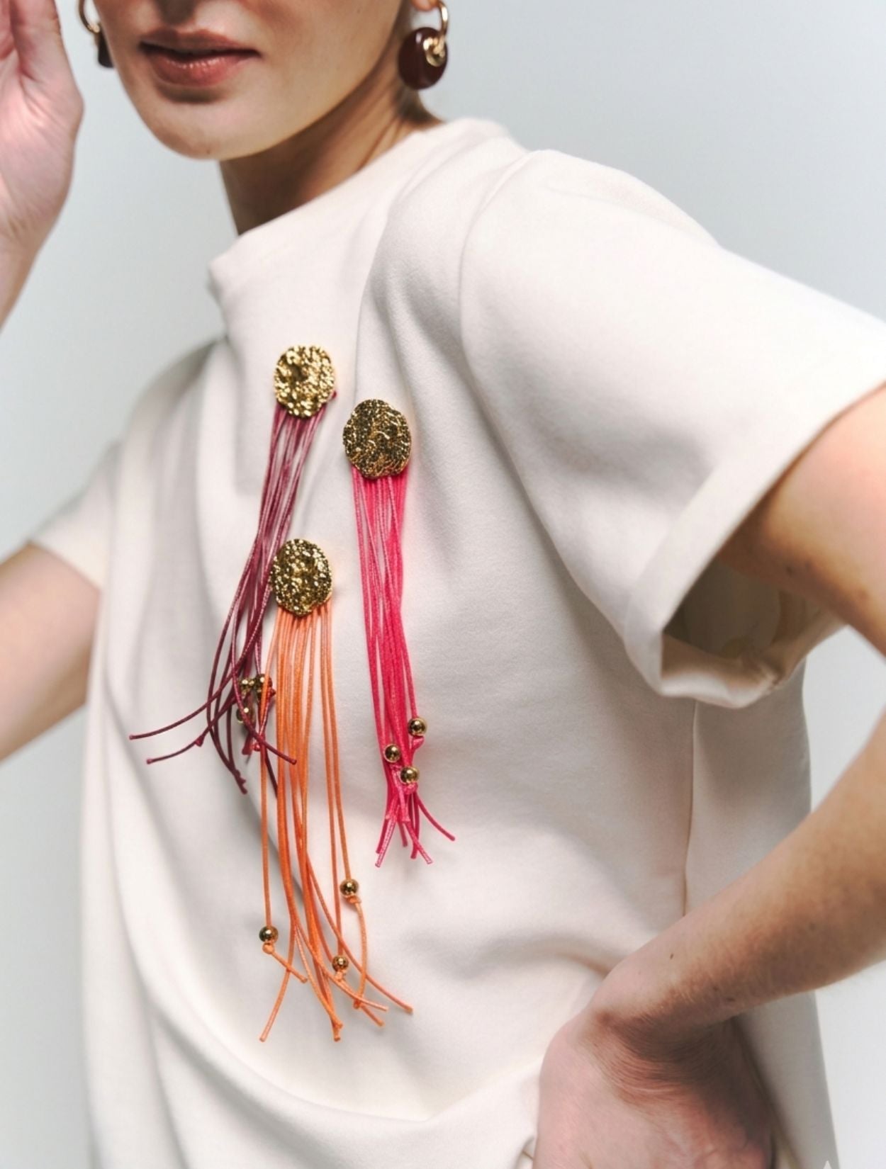 T-shirt suave de corte clásico con intervención manual de botones dorados texturizados y tiras de cuero en tonos cálidos.