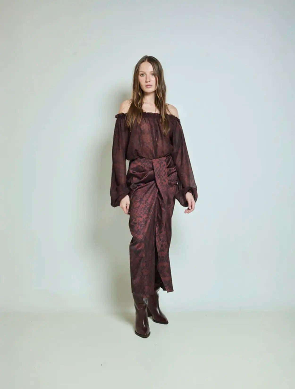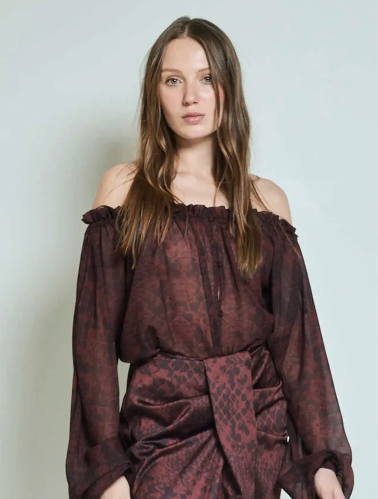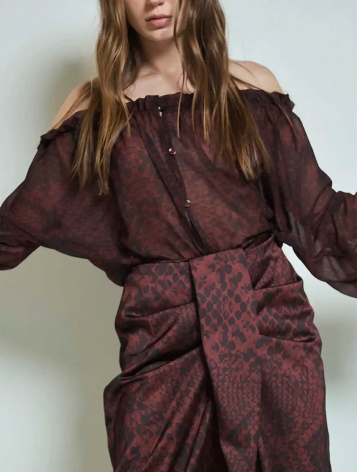 Camisa de velo roja con estampado de pitón, escote en hombros, abotonadura frontal y manga resortada.