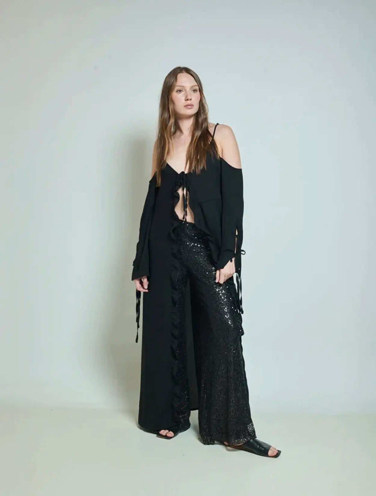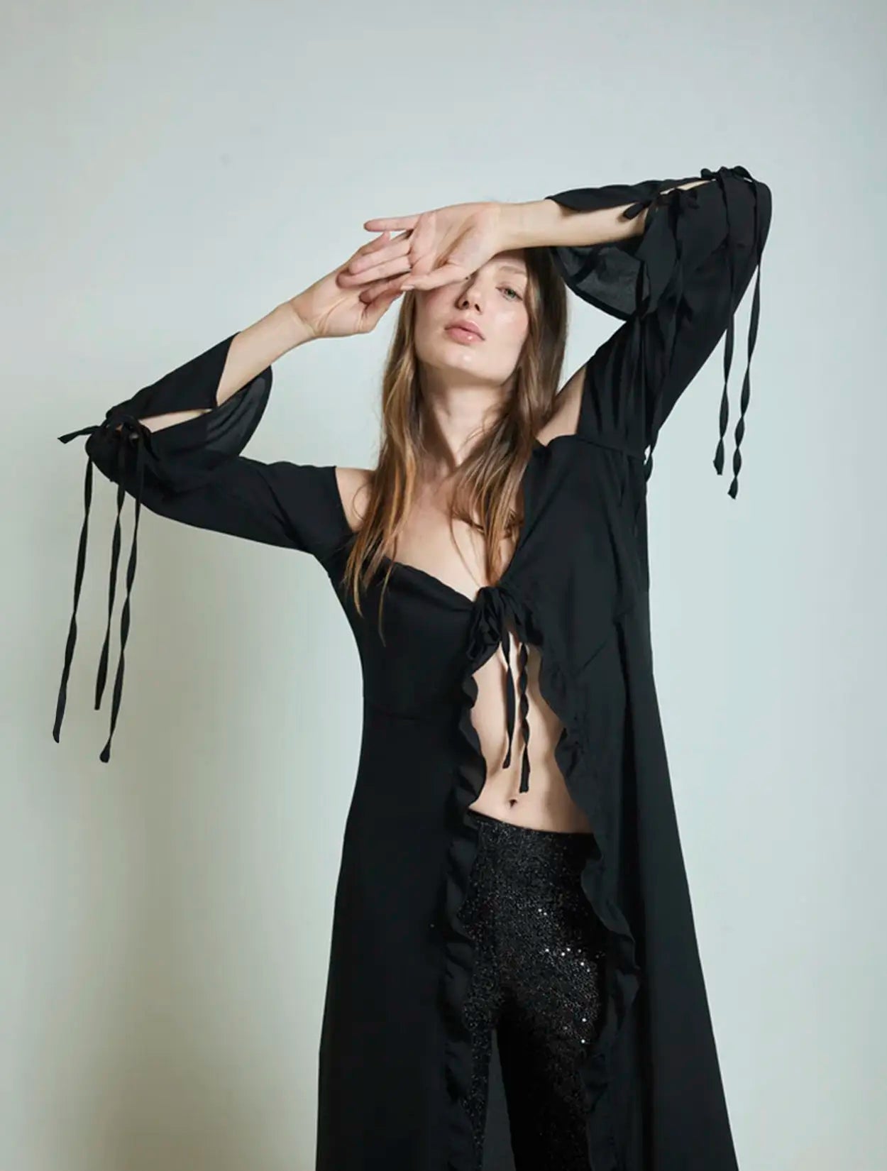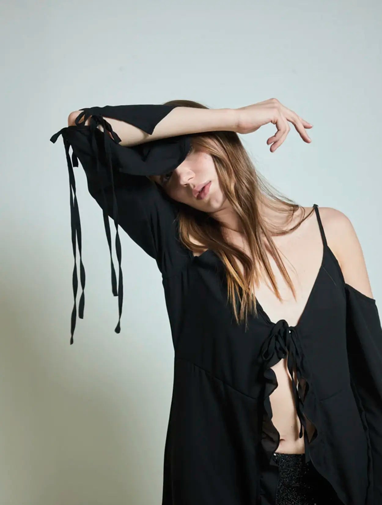 Camisa larga en velo negro con escote en hombros y sistema de amarre frontal y en mangas.