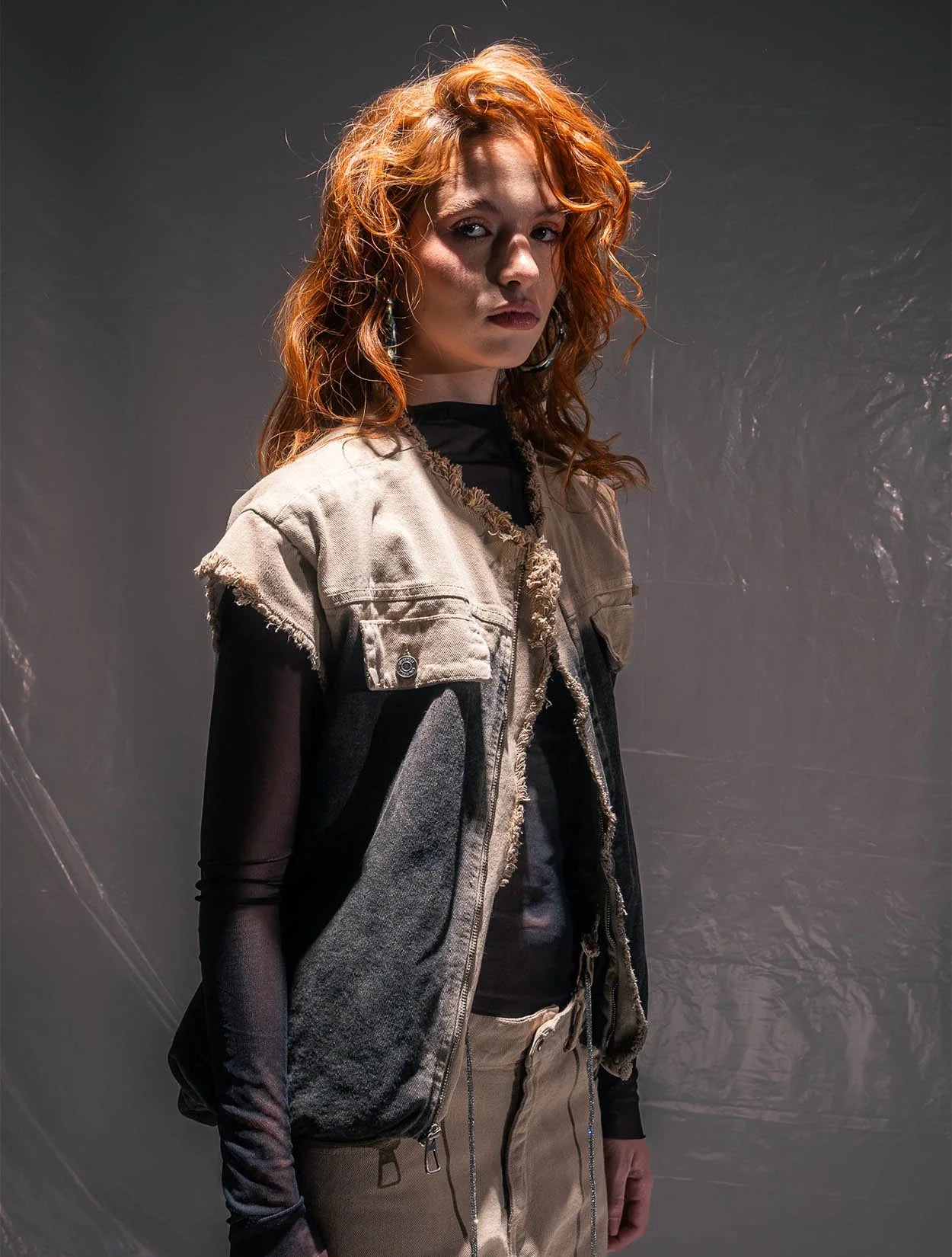 Chaleco en denim color caqui con degradé negro hecho a mano. Detalles únicos: cremallera frontal, bordado en la espalda cortado a láser y desflecado, con la frase "Indómito" que refleja su espíritu rebelde. Esta pieza es un statement que no puede faltar en tu armario. Será esa prenda indispensable para crear un wild look.