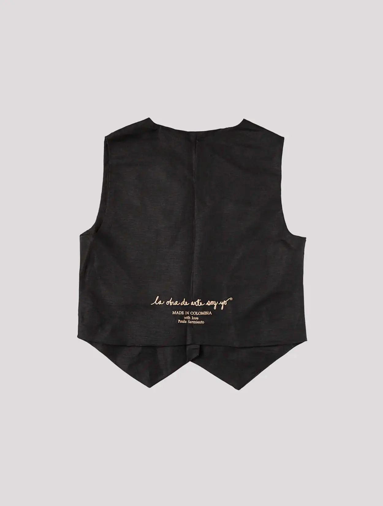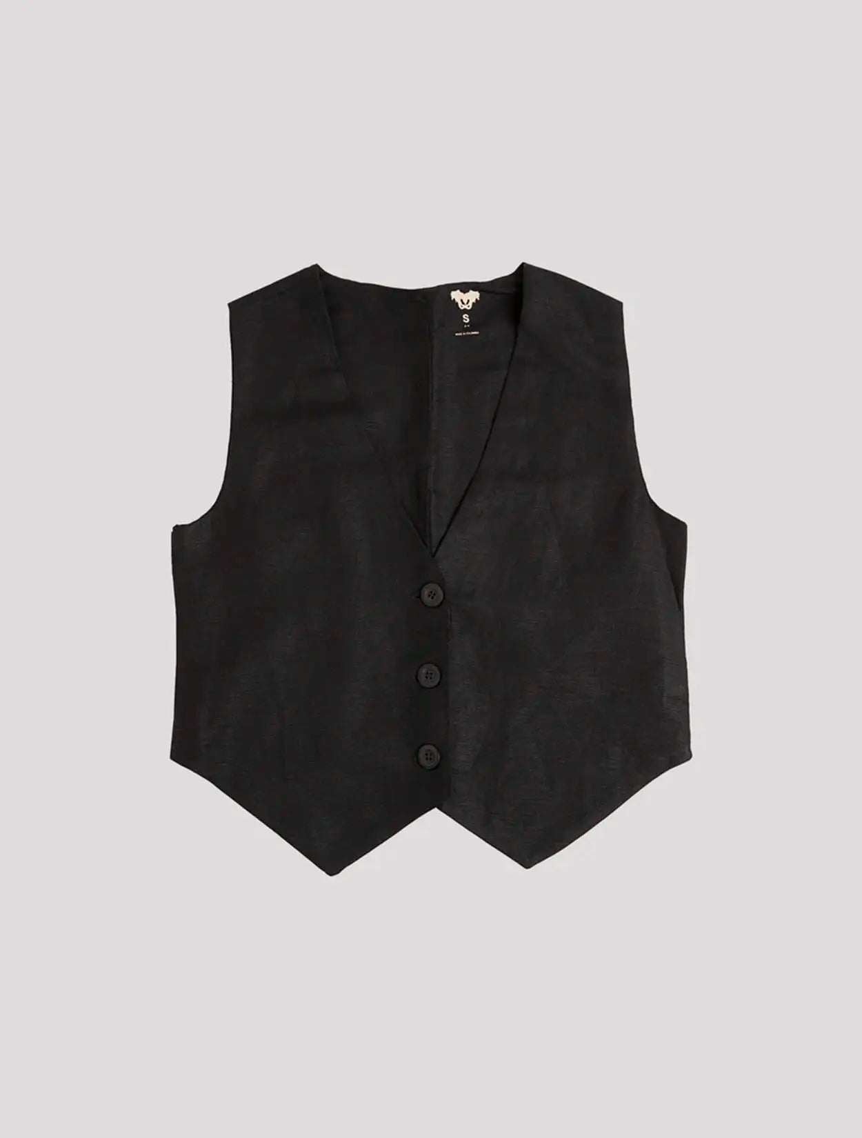 Chaleco tipo sastre en lino con bordado en espalda y botones.