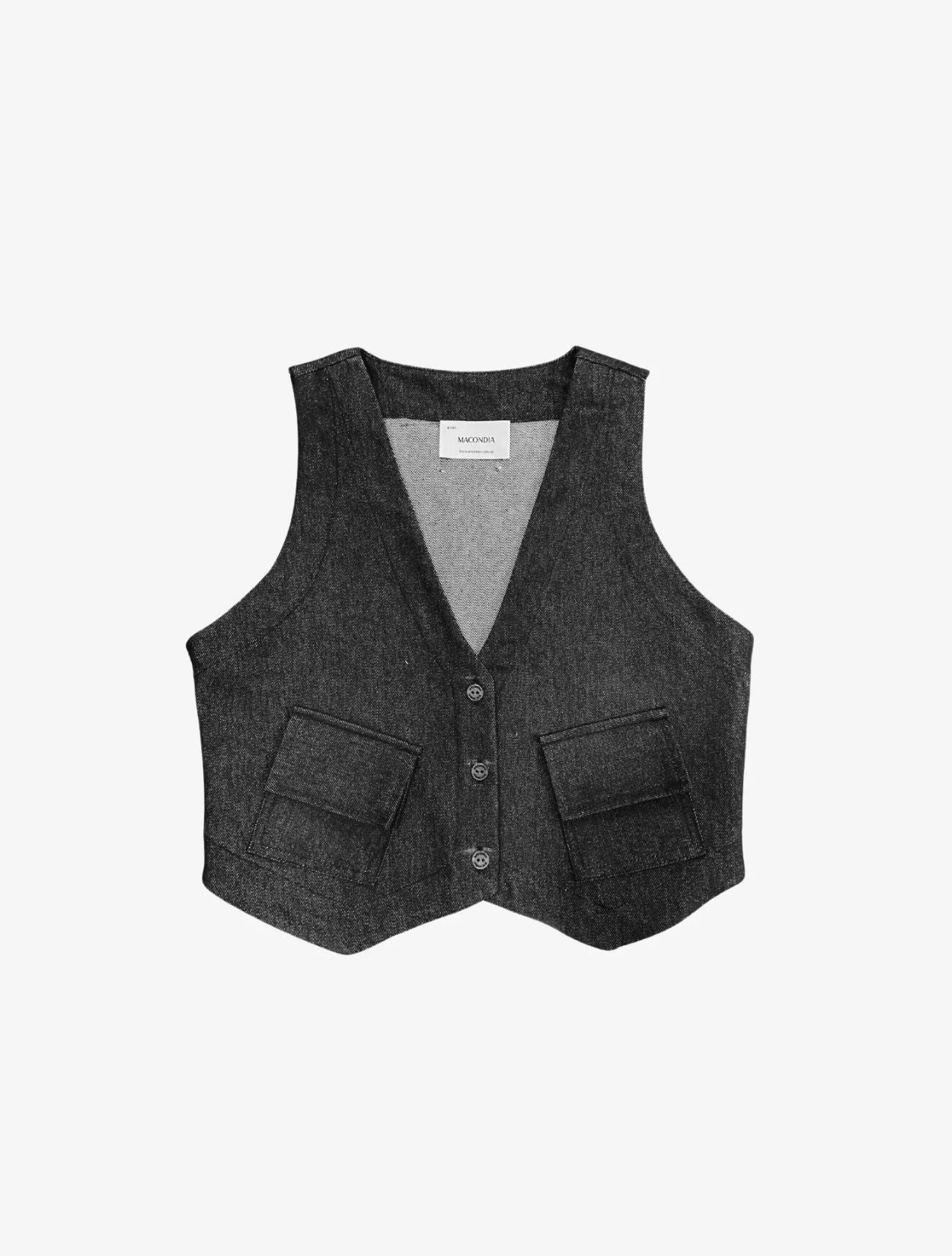 Chaleco con botones minimalista en denim azul con dos bolsillos frontales.