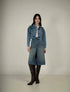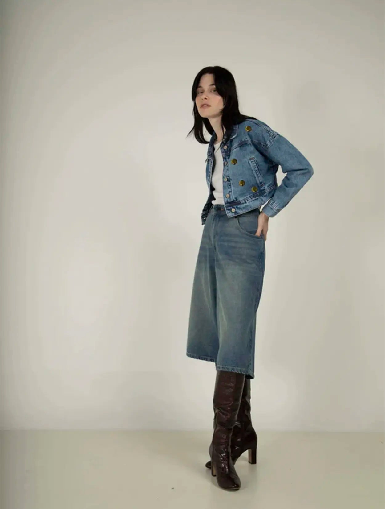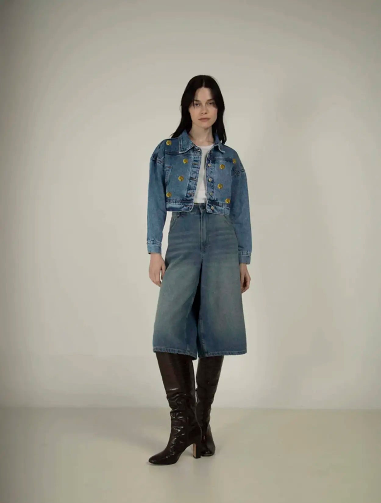 Chaqueta de denim corta con botones, bolsillos laterales y broches dorados.
