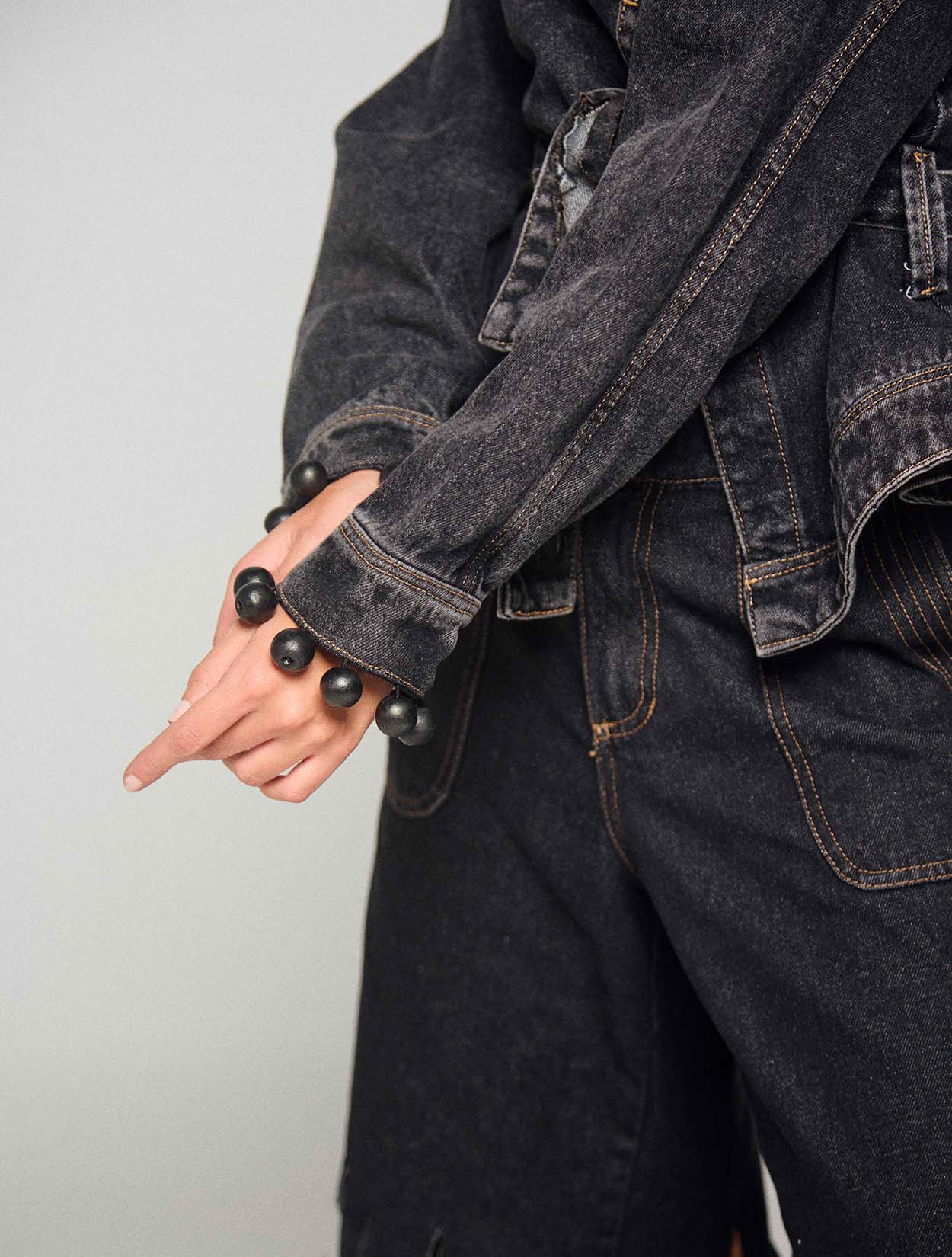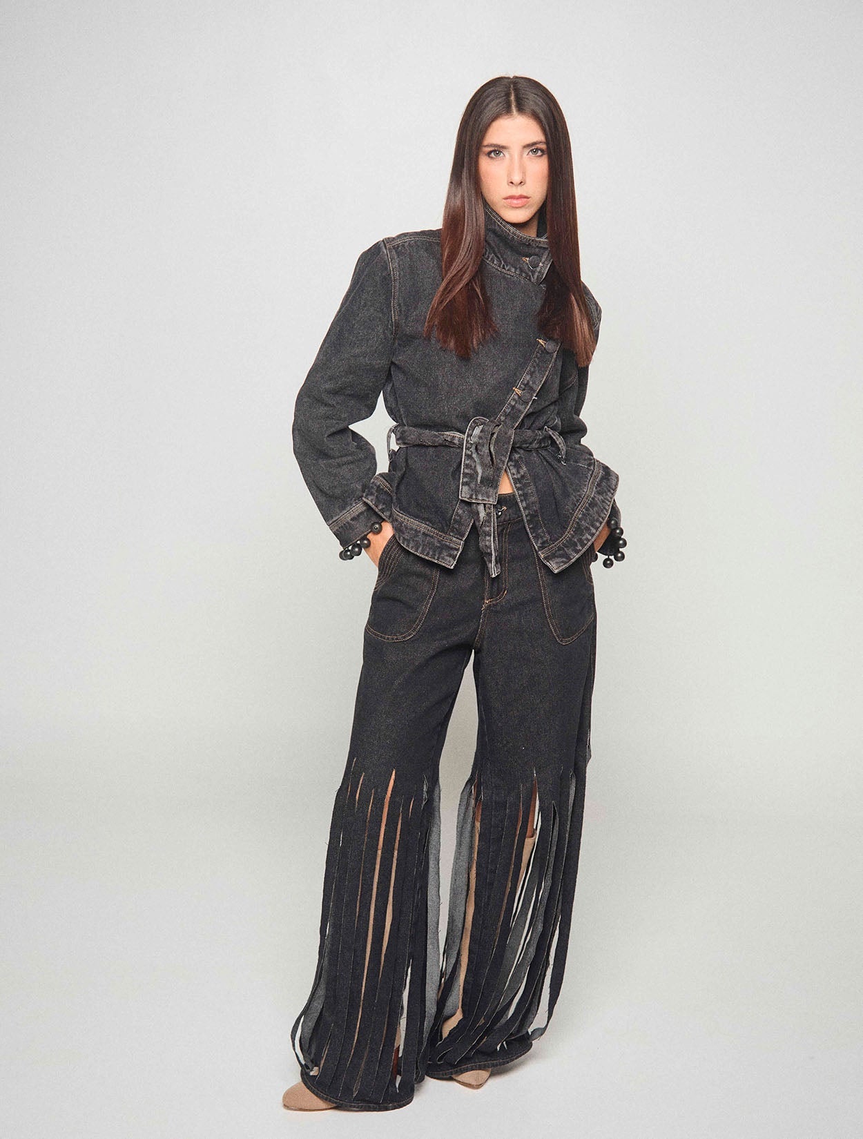 Confeccionada en denim negro, tiene estructura, presencia y un aire sofisticado que eleva cualquier look. Su diseño se caracteriza por el cinturón ajustable en la cintura, que permite moldear la figura y crear un efecto reloj de arena perfecto. Los botones dispuestos en diagonal añaden un toque de diseño contemporáneo, mientras que el cuello estructurado se convierte en el punto focal de la prenda.