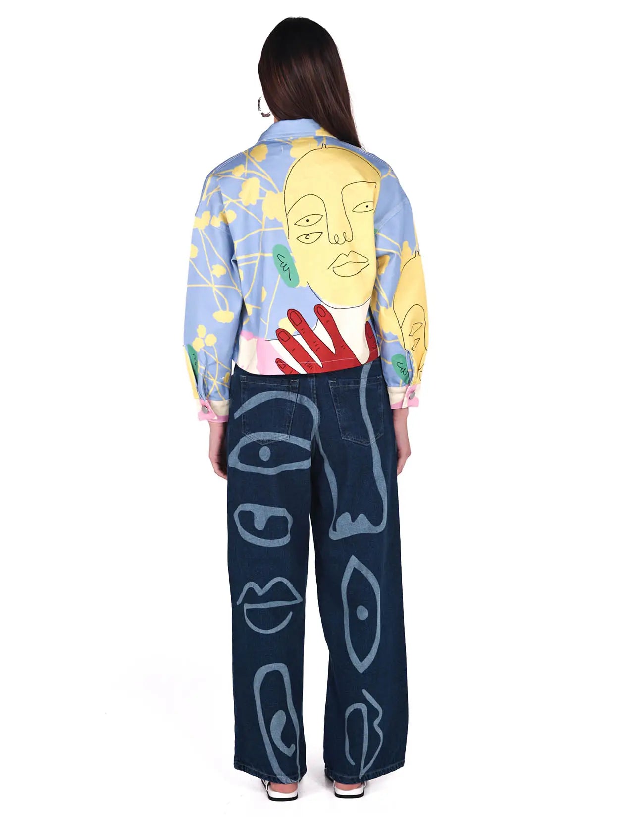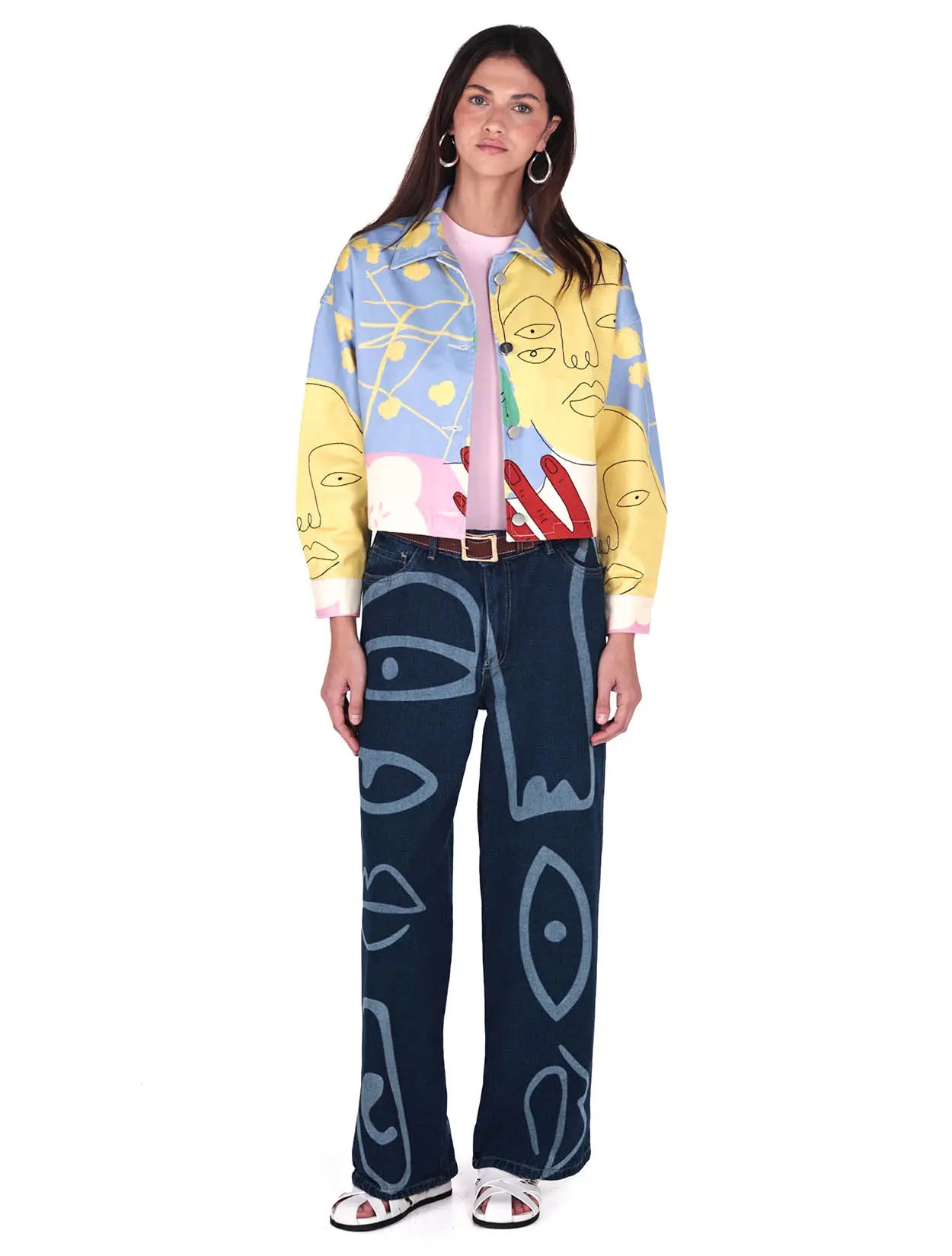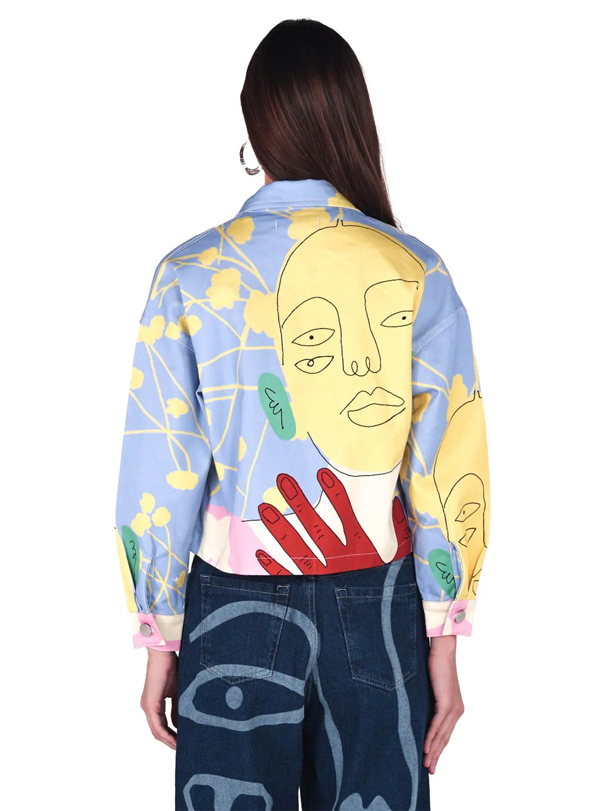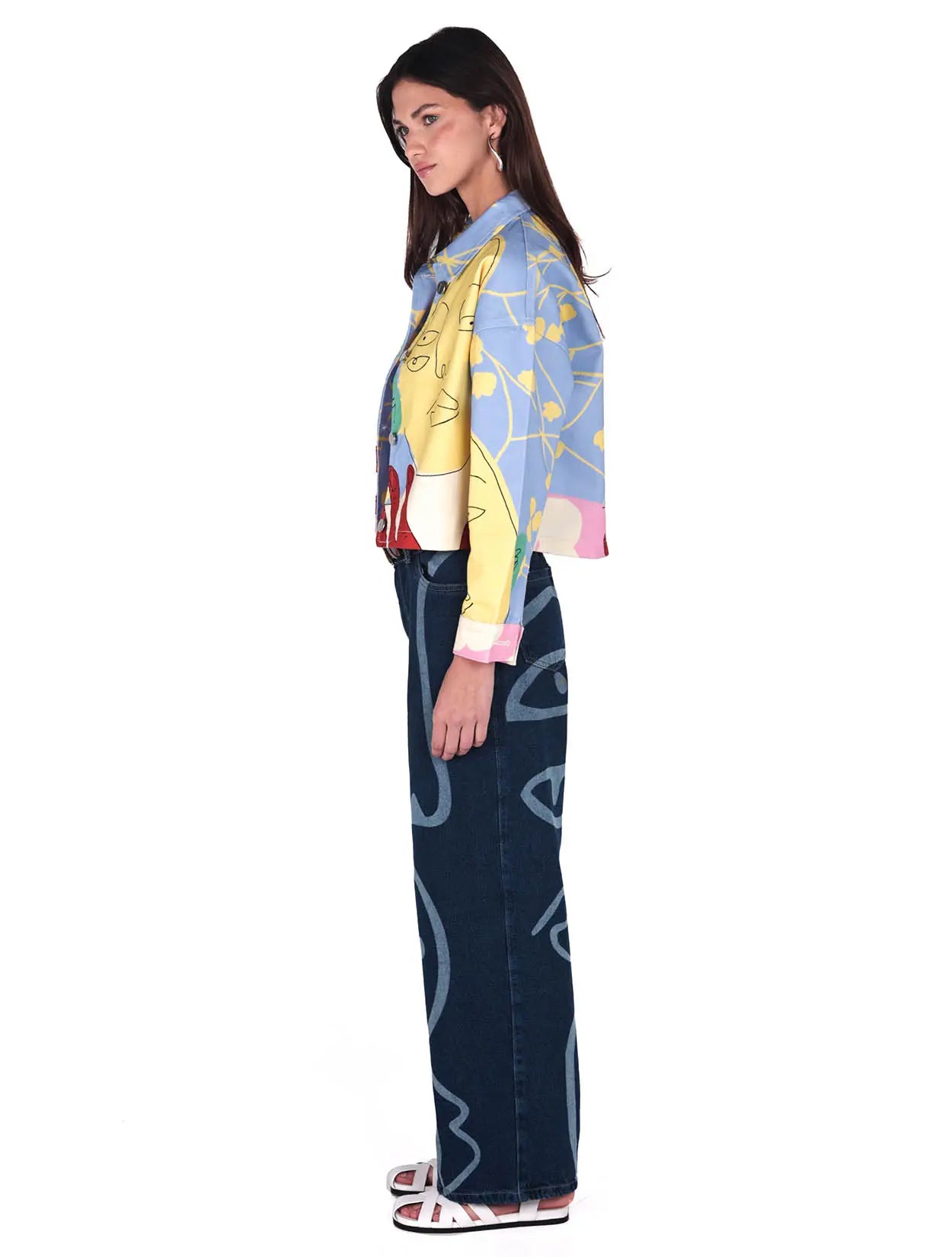 Chaqueta de corte clásico que se transforma en una pieza única gracias a su diseño de arte lineal minimalista; presenta bordados de ojos y rostros en contraste, creando un efecto vanguardista y llamativo.