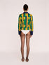 Chaqueta con un diseño vibrante y contemporáneo. Elaborados en dril de poliéster de alta calidad, tejidos en Colombia para garantizar su durabilidad, presentan un estampado de rayas verticales en tonos verdes, amarillos y azules, decorado con figuras gráficas en contraste. Esta pieza fue tejida, diseñada, ilustrada, confeccionada y empaquetada por manos colombianas especialmente para ti.
