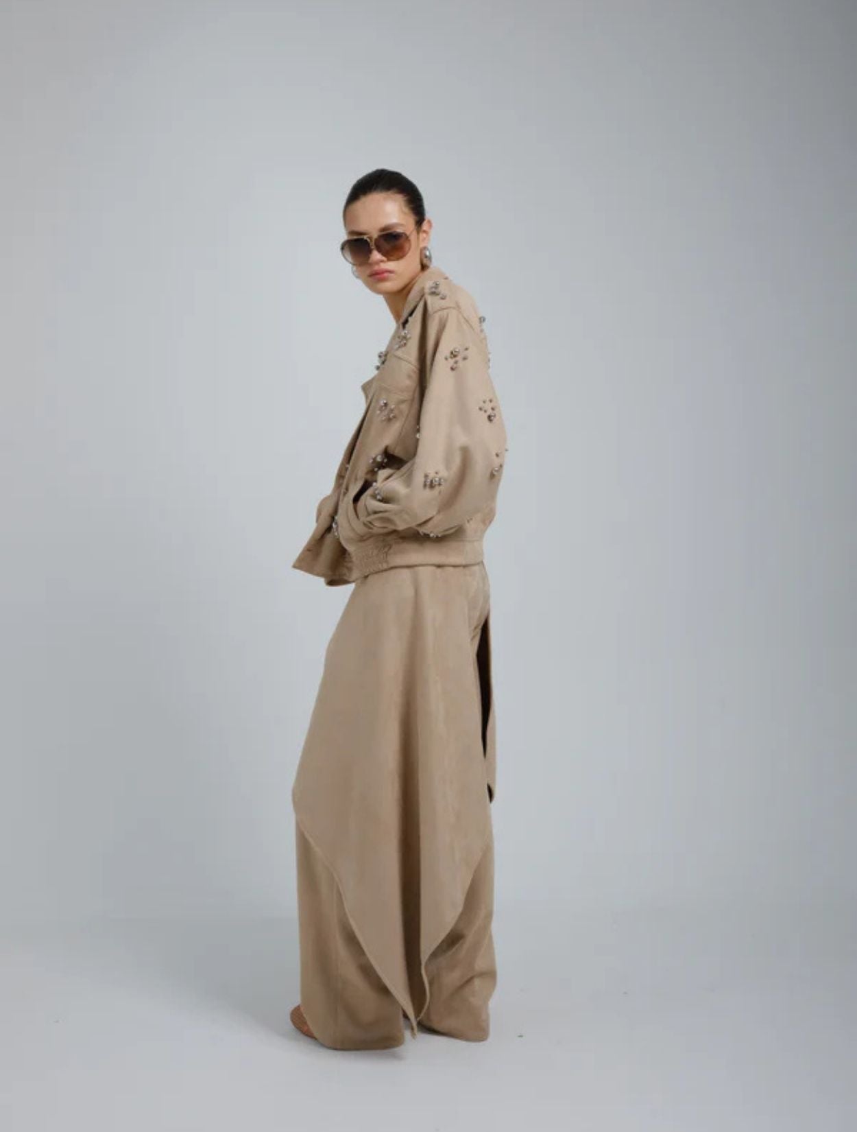 Chaqueta tipo Biker oversized en gamuza, con bordado en taches metálico en la parte delantera, posterior, cuello y mangas, con bolsillos diagonales al costado y abotonadura como sistema de cierre.