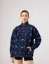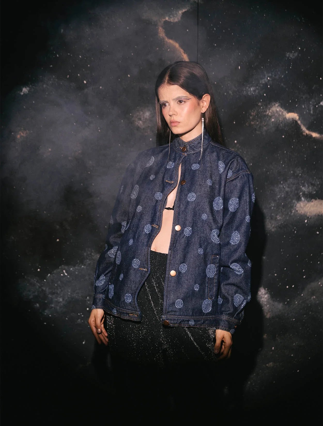 Nuestra obra de arte Neptuno está inspirada en la suite orquestal Los planetas, del compositor Gustav Holst. Una prenda que carga con el carácter astrológico que la música nos transmite. Neptuno tiene texturas redondas hechas con láser y ondas en su frente que le brindan autenticidad y la diferencian de las demás. Tiene un cuello alto con botones, bolsillos en la parte frontal y el logo del planeta bordado en la parte alta de la espalda.