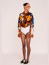 Chaqueta de corte corto y ligeramente boxy. Presenta un estampado vibrante y abstracto/orgánico en una rica paleta de colores: marrón, amarillo, mostaza, azul, blanco y negro. El cuello, los bolsillos del pecho y los puños están detallados con aplicaciones de cuero o material tipo cuero marrón en contraste. El cierre es de botones o cremallera oculta.