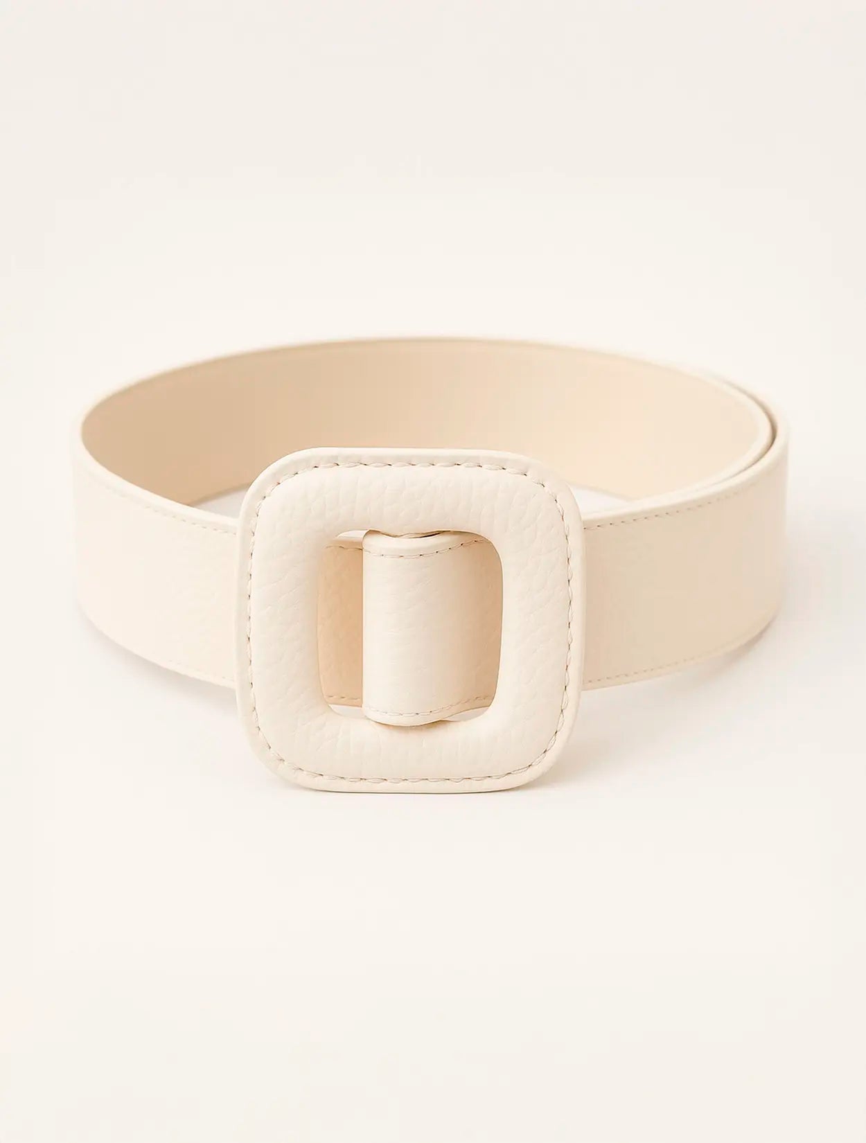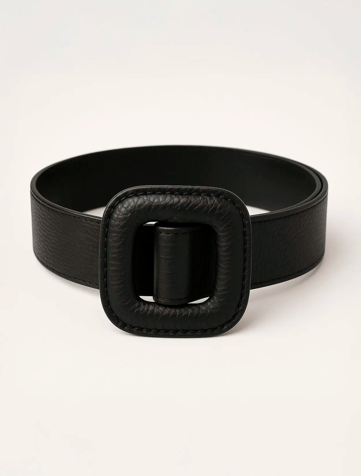 El Cinturón Merlot en color negro destaca por su material de piel graneada y texturizada , que aporta un lujo suave y orgánico al diseño. Su estética se centra en la voluminosa hebilla cuadrada completamente forrada, creando una pieza de declaración moderna.