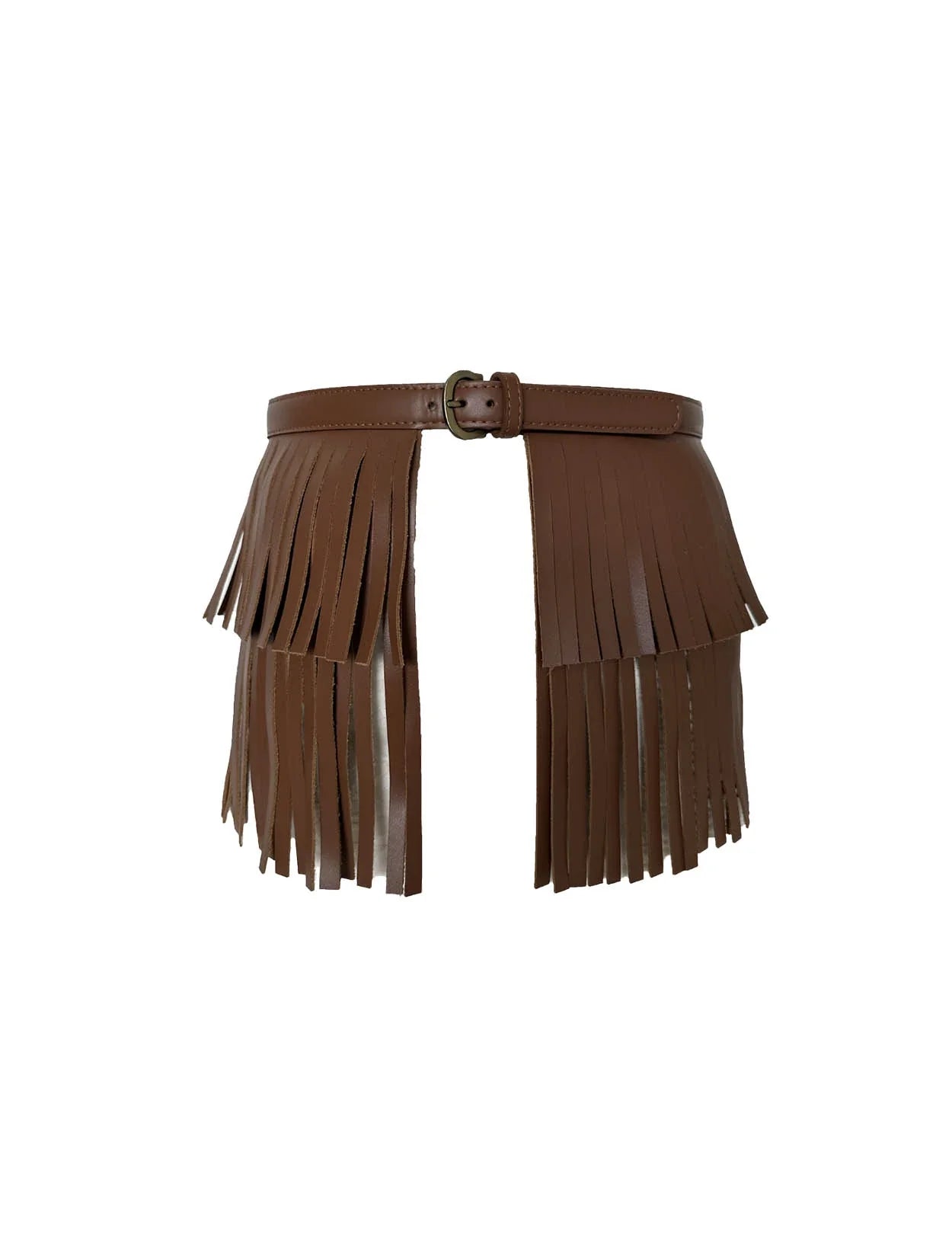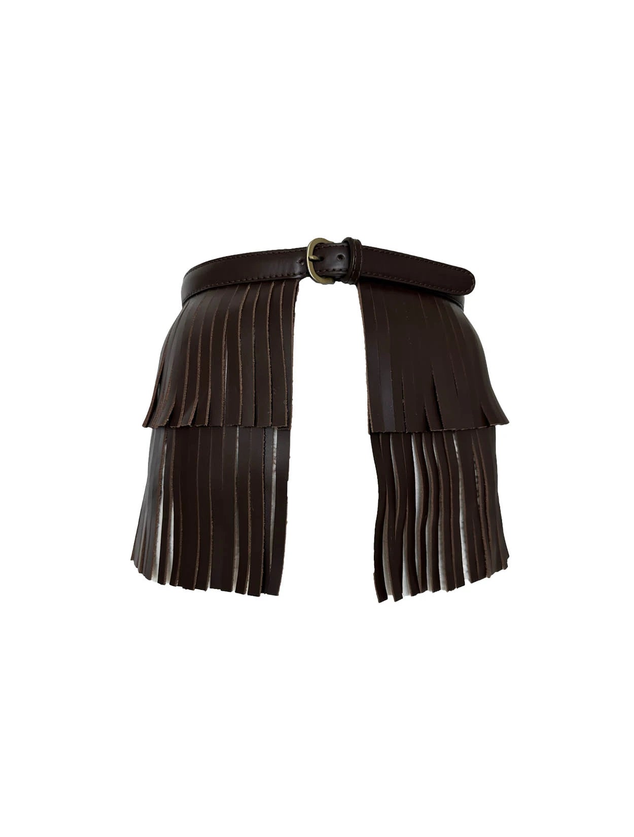 WILD WEST es un cinturón de cuero artesanal, adornado con flecos que encarnan el espíritu salvaje de la frontera.