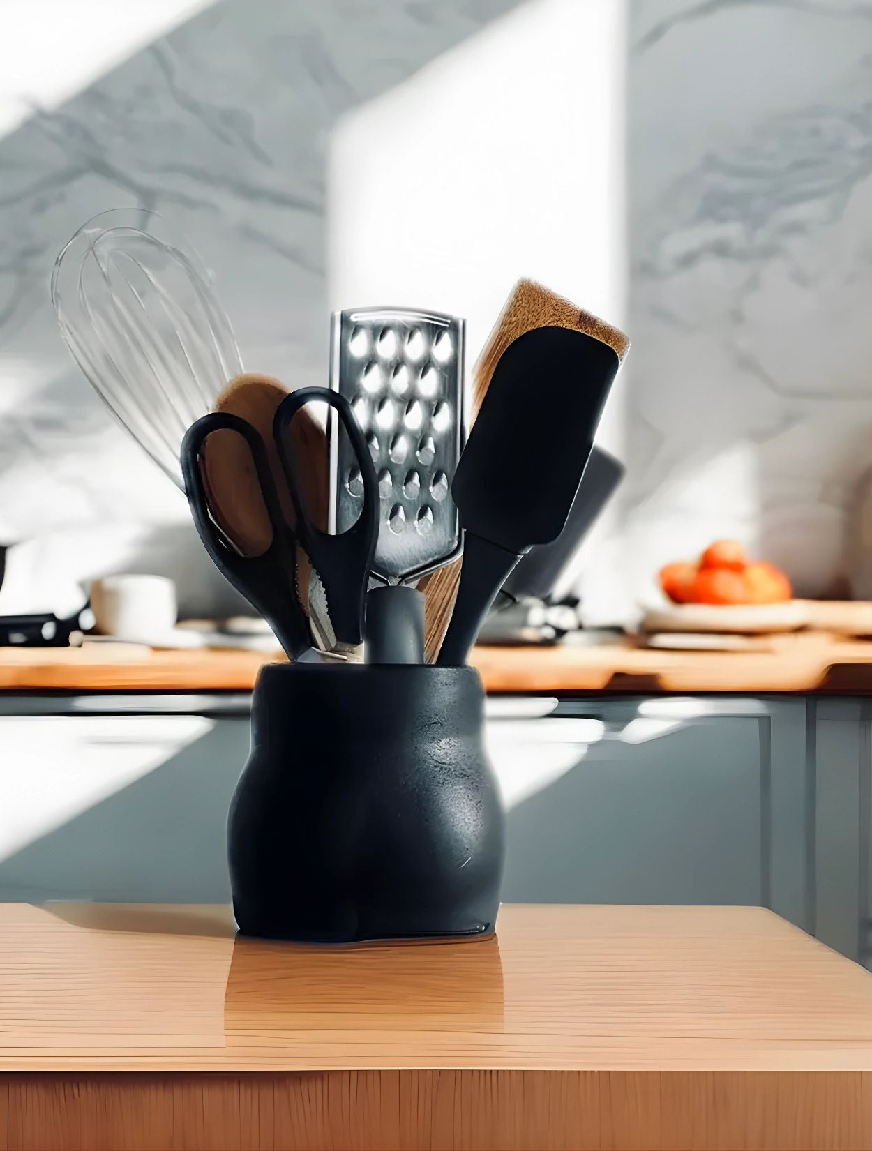 La versatilidad del contenedor se manifiesta en su adaptabilidad a múltiples entornos y usos. En la cocina, se transforma en un elegante porta utensilios. Sobre un escritorio, se convierte en un sofisticados portalápices y en el baño, ofrece un hogar estilizado para brochas y productos de belleza.