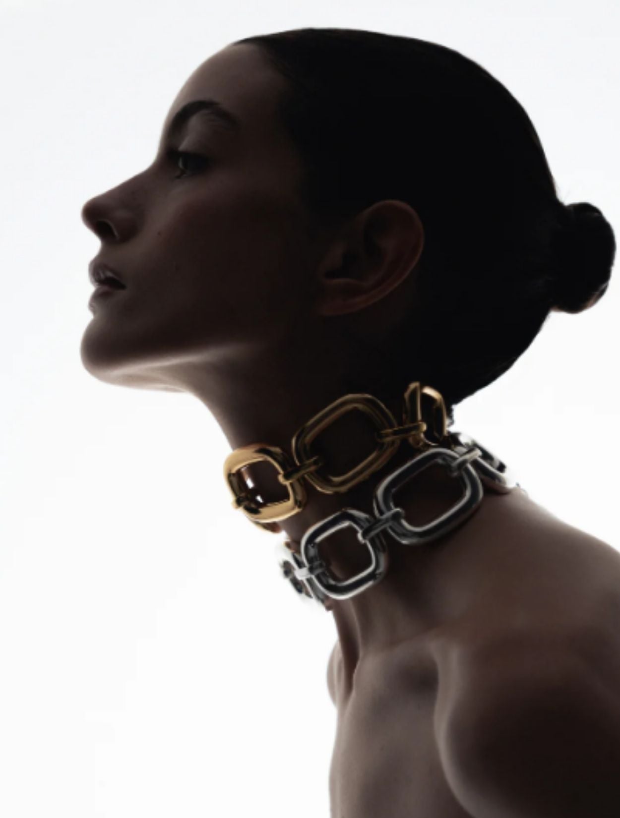 Una gargantilla que es una verdadera declaración de estilo. Este diseño audaz presenta una cadena de eslabones cuadrados y grandes que capturan la atención. La combinación de acabados metálicos resalta la modernidad de la pieza.