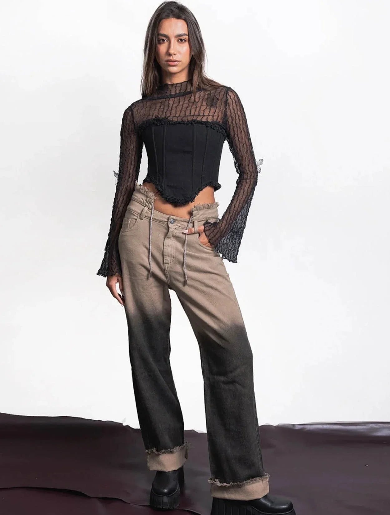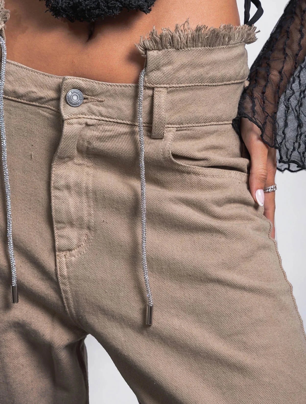 Jean en denim , silueta oversized y low waisted en tono caqui con degradé negro hecho a mano, diseñado para destacar. Cuenta con una doble pretina ajustable con cordón brillante que aporta un toque sofisticado. La bota desflecada refuerza su carácter único y moderno, ideal para un look atrevido y auténtico.