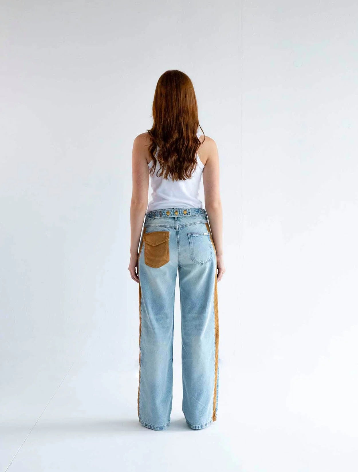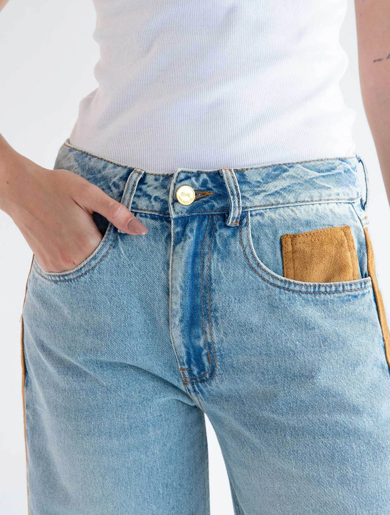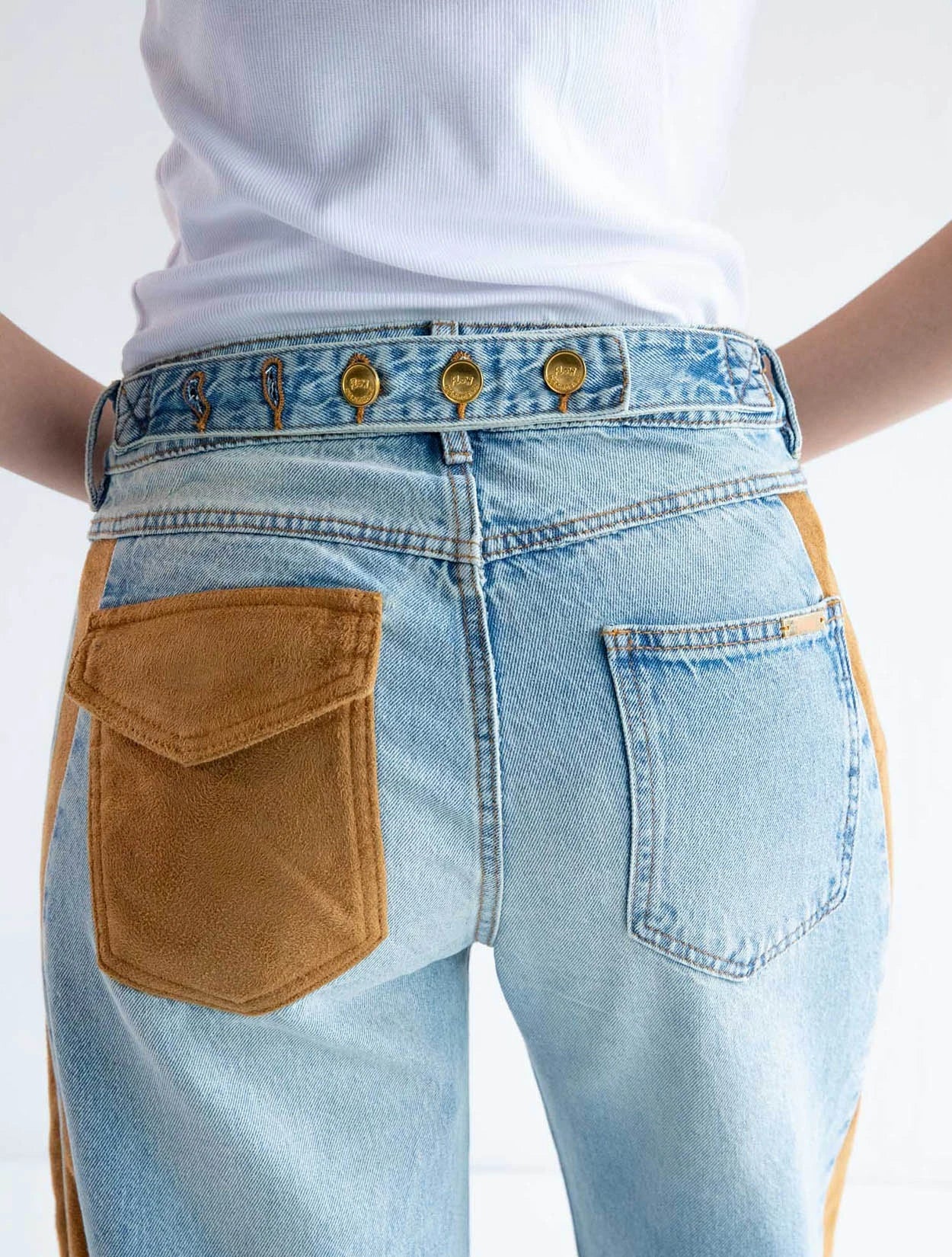 Jean vaquero con bota recta con talle medio, jean vaquero con detalles laterales y bolsillos posteriores en gamuza color miel