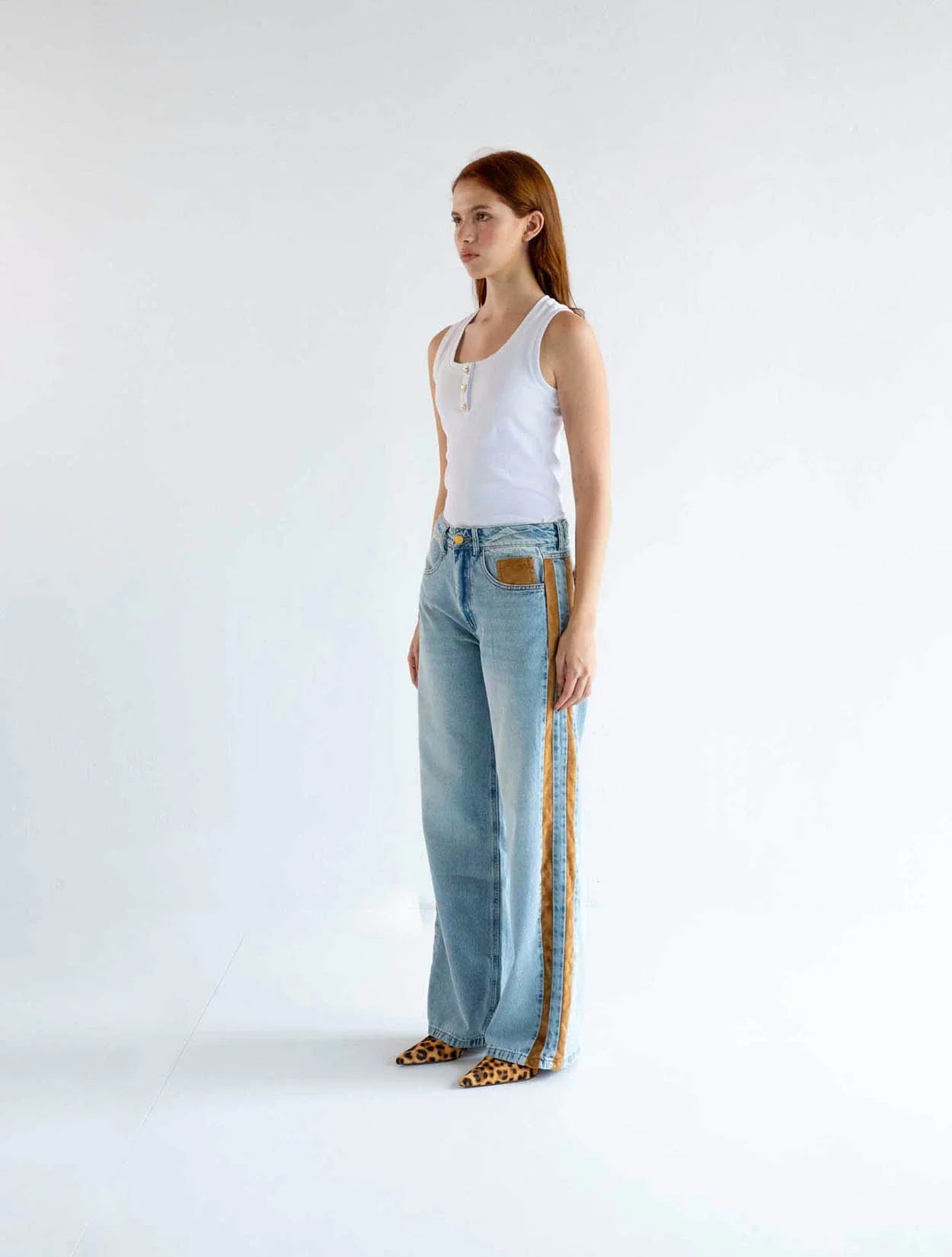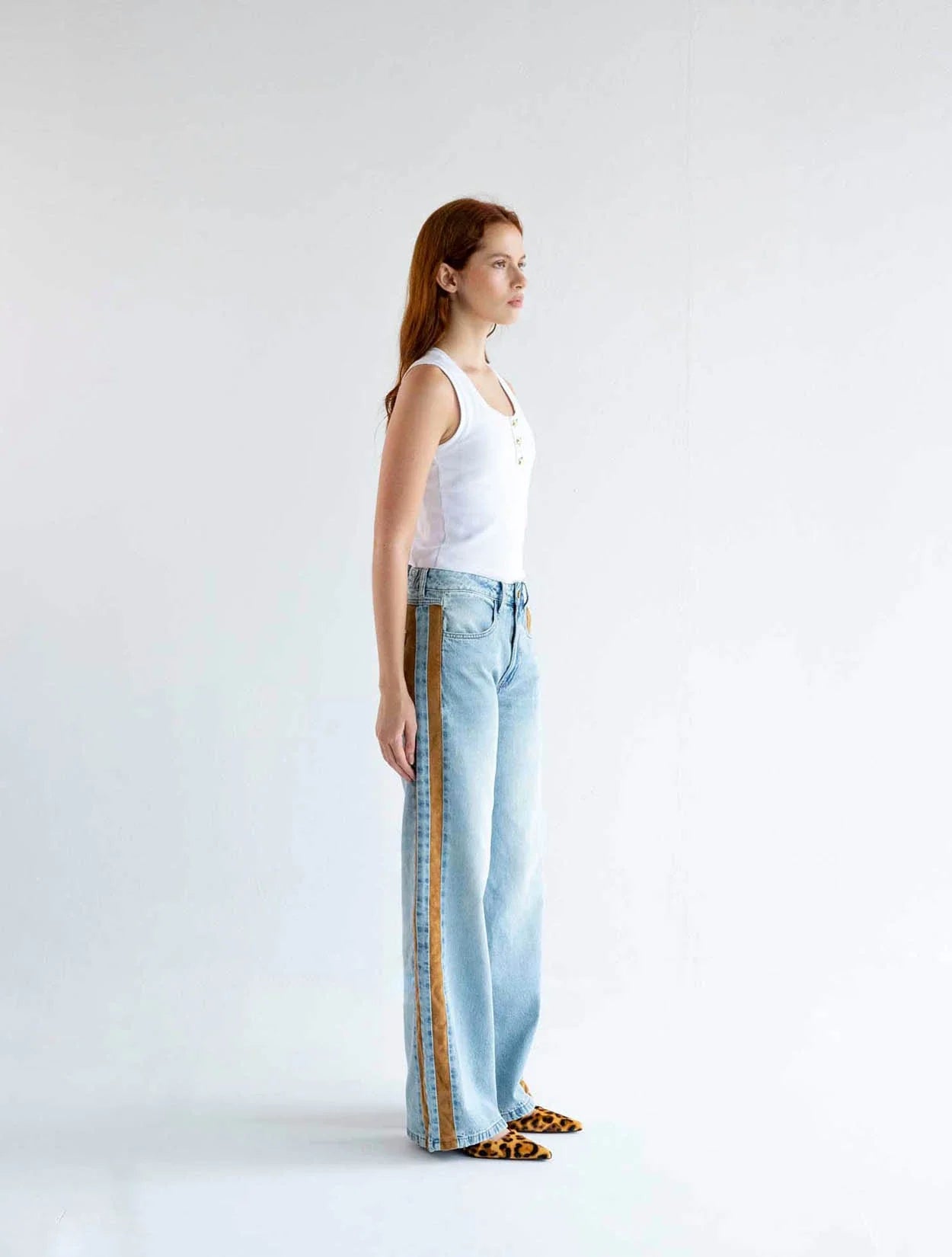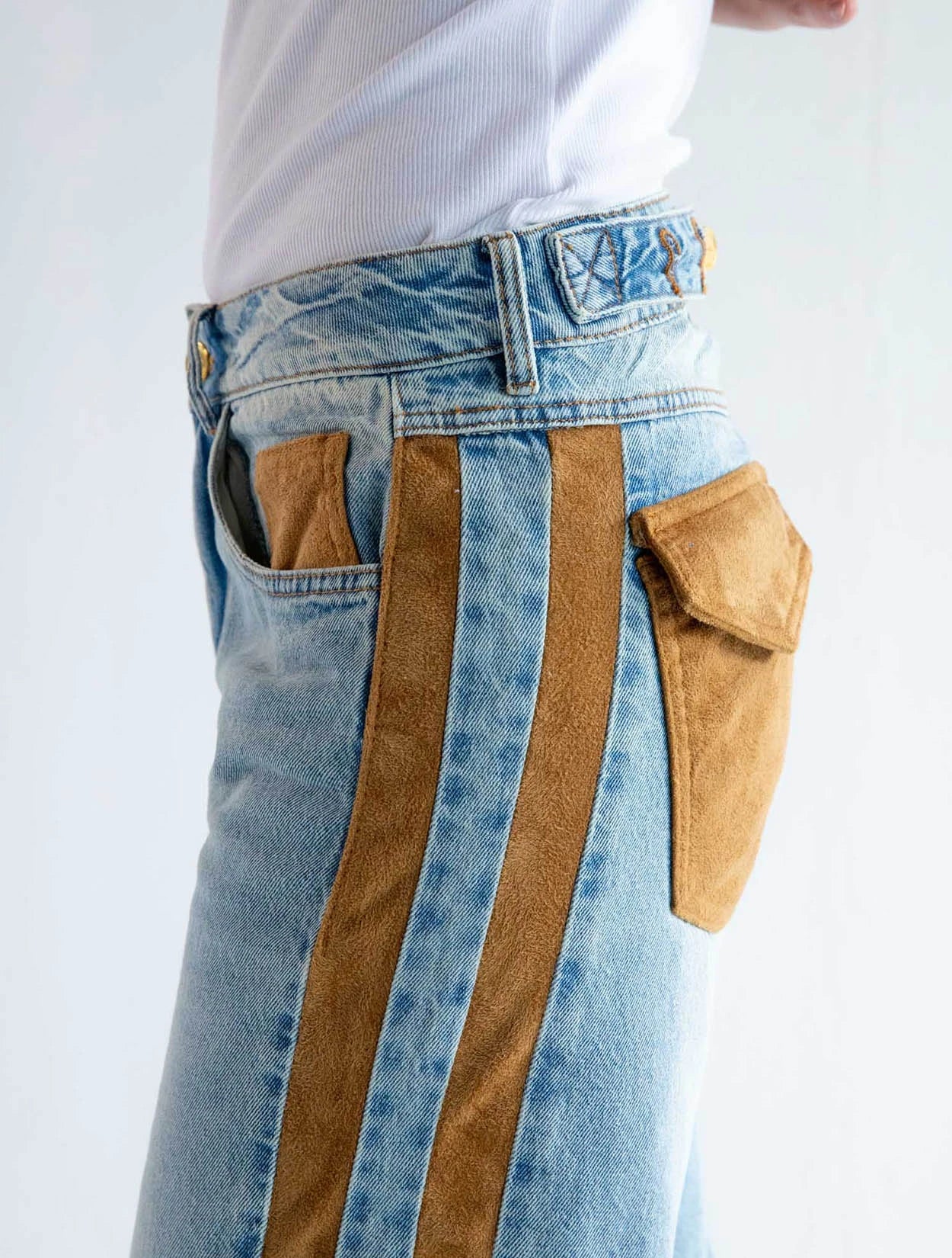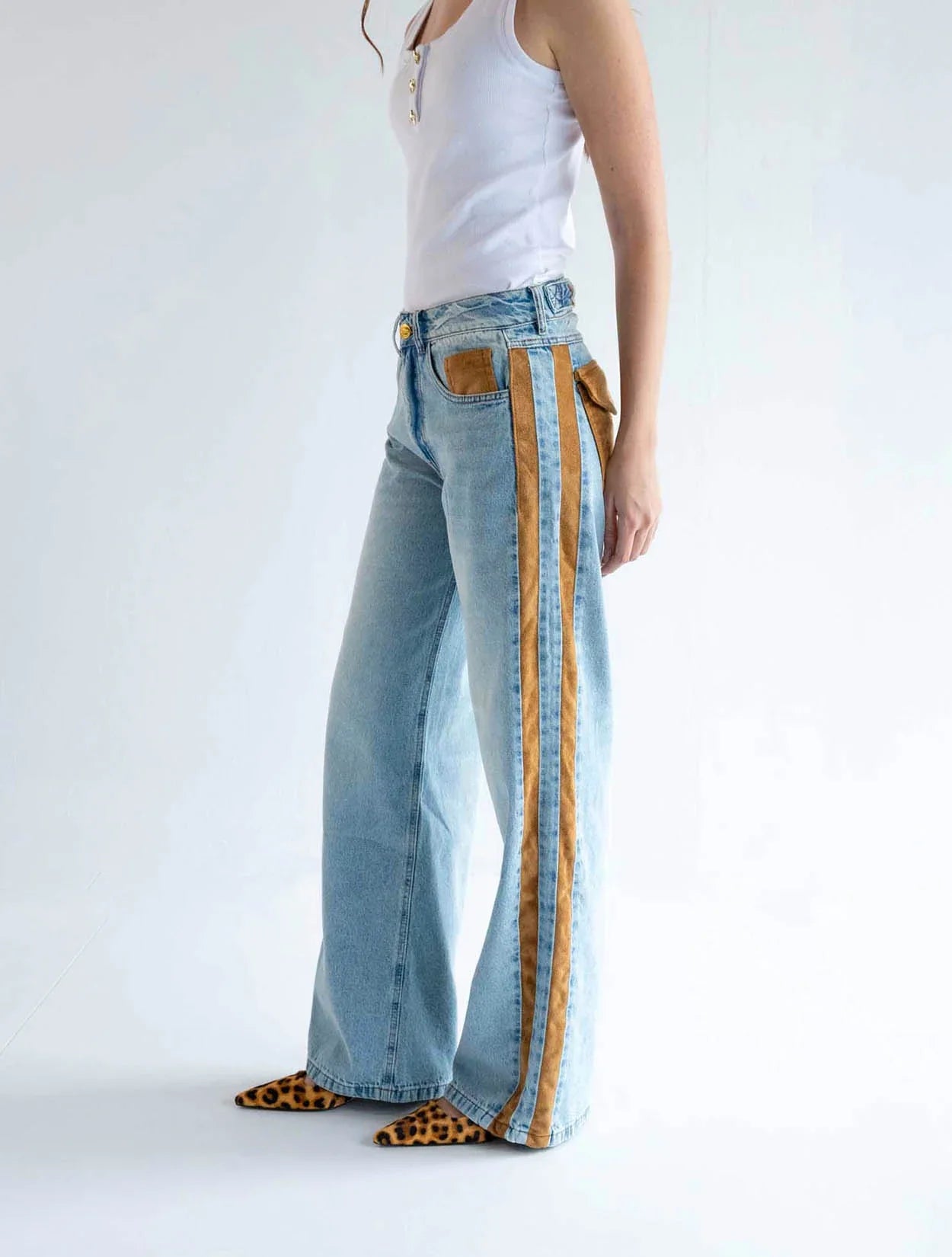 Jean vaquero con bota recta con talle medio, jean vaquero con detalles laterales y bolsillos posteriores en gamuza color miel