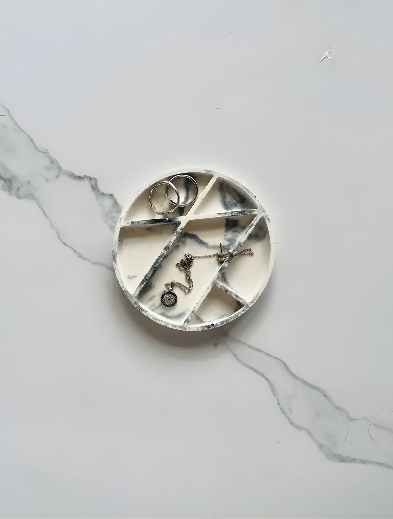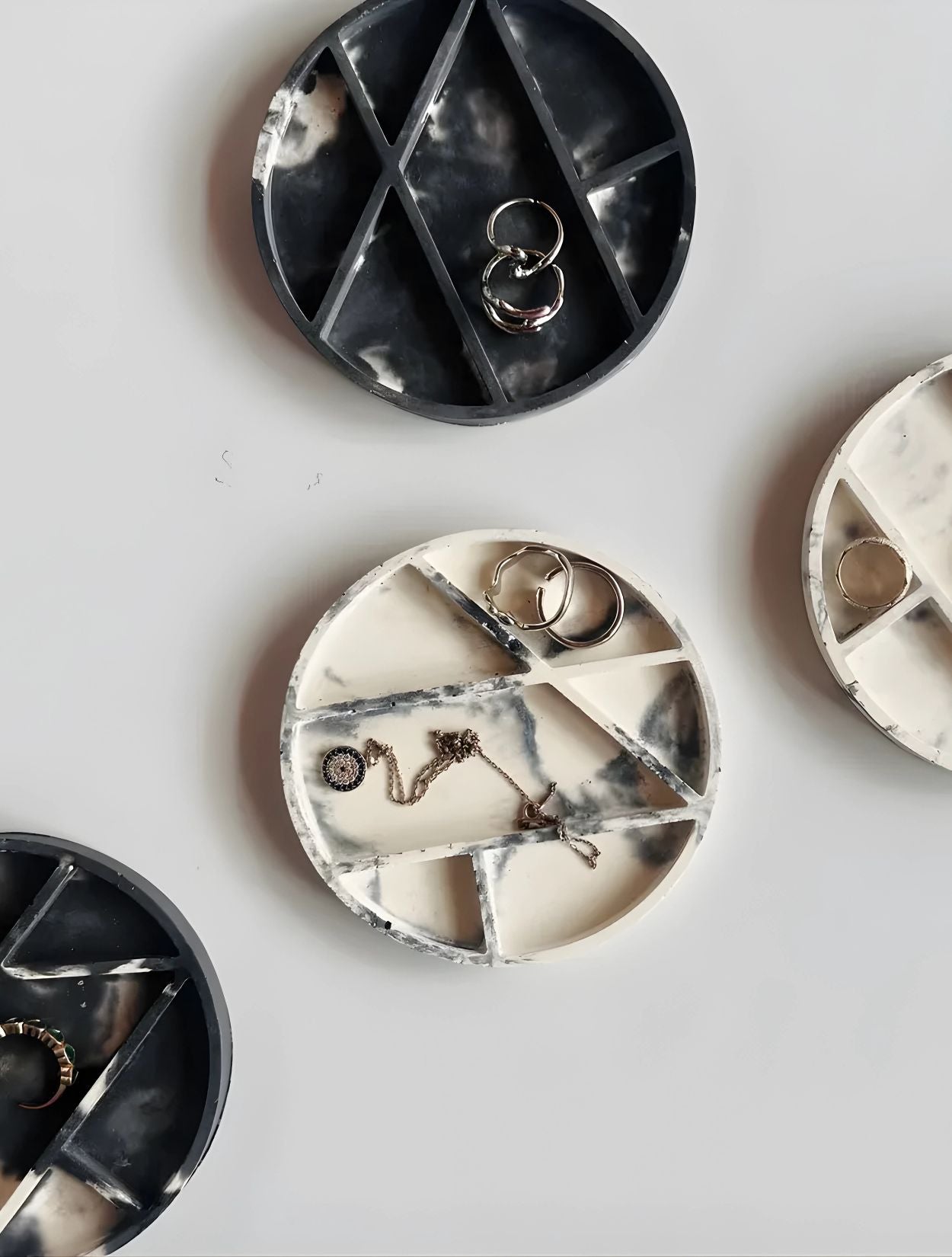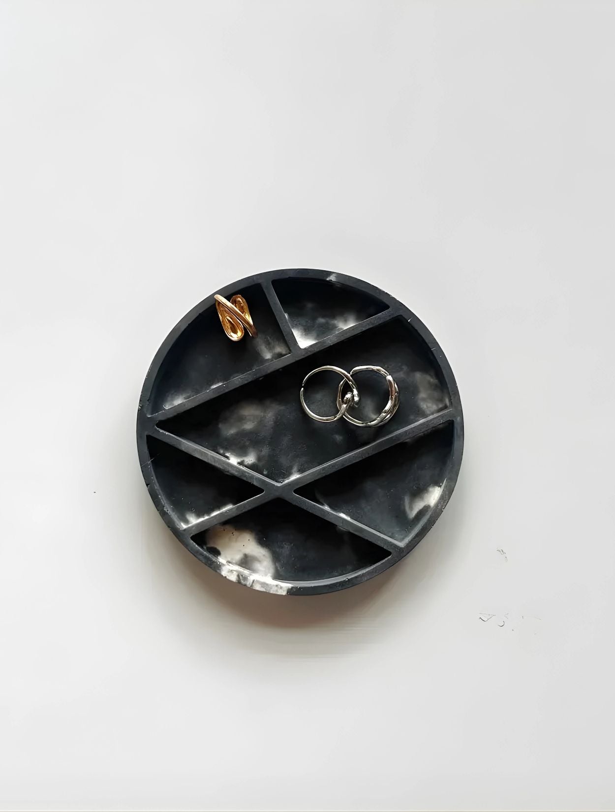 El mini joyero Geometría está hecho de cemento con un acabado negro carbón o marmoleado que lo convierte en un objeto decorativo por sí mismo.
