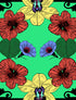 Pañoleta con un diseño botánico que destaca orquídeas amarillas y flores carmesí sobre un vibrante fondo menta.
