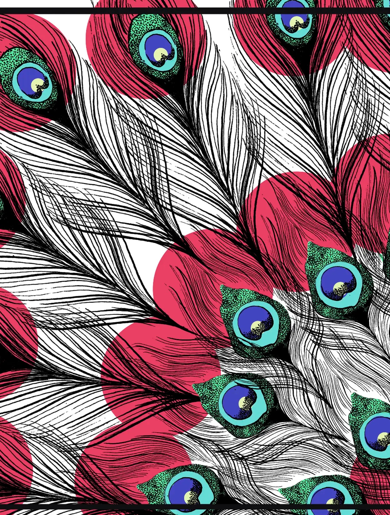 Pañoleta con un diseño impactante inspirado en las plumas de pavo real. El patrón destaca por su elegancia exótica, combinando el contraste de las plumas en blanco y negro con círculos vibrantes en rojo granate y los icónicos "ojos" en tonos azul y verde esmeralda . Ideal para un toque audaz y cómodo.