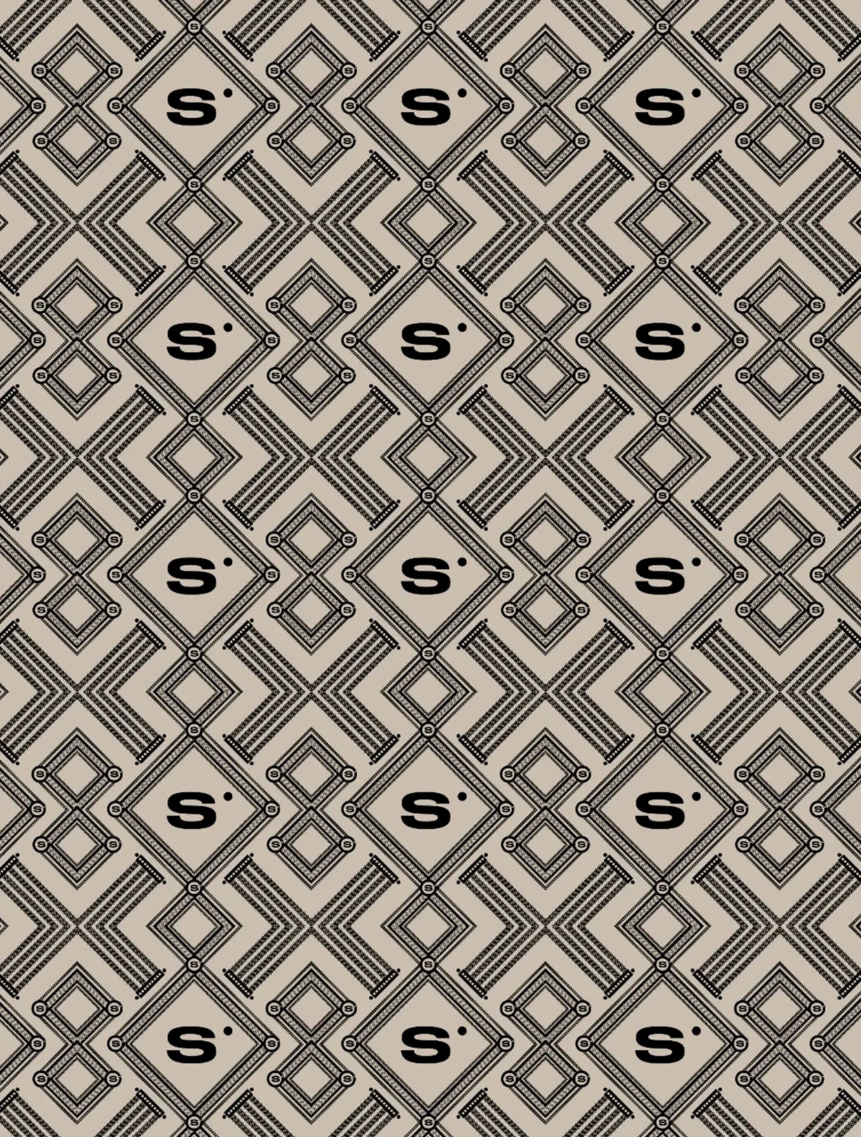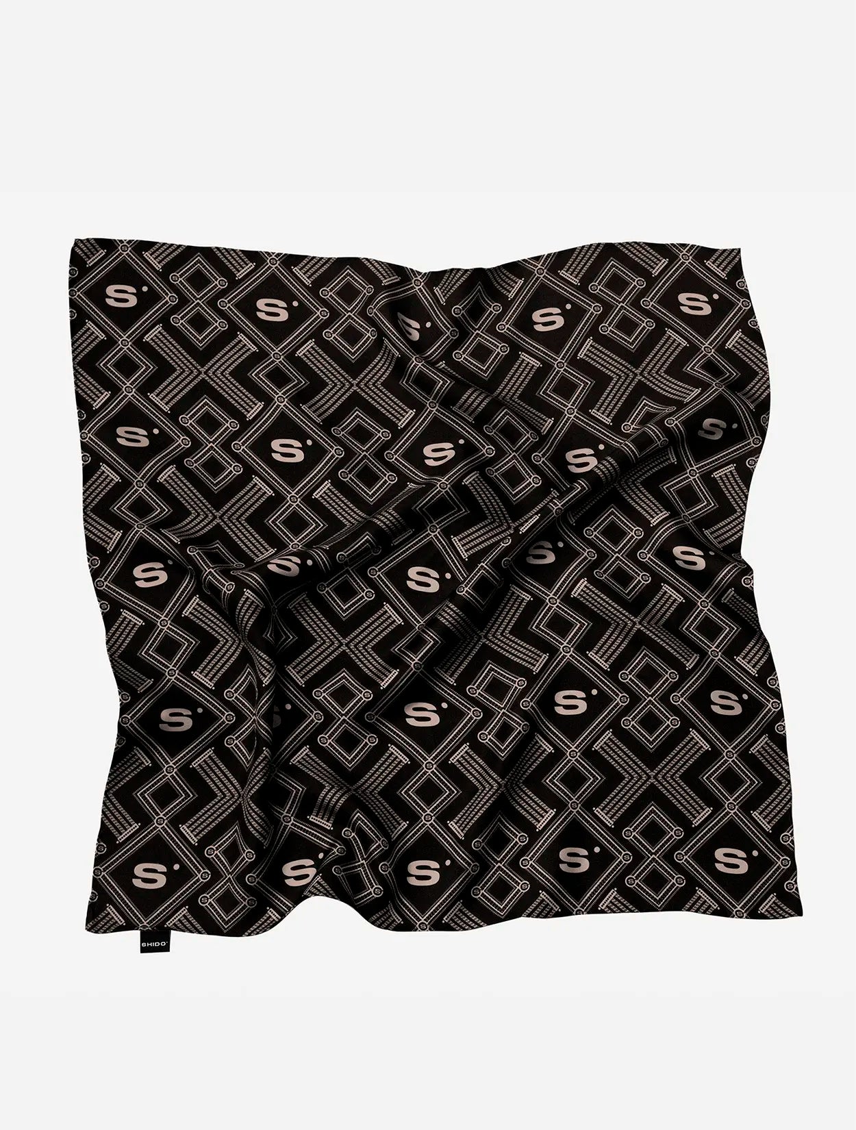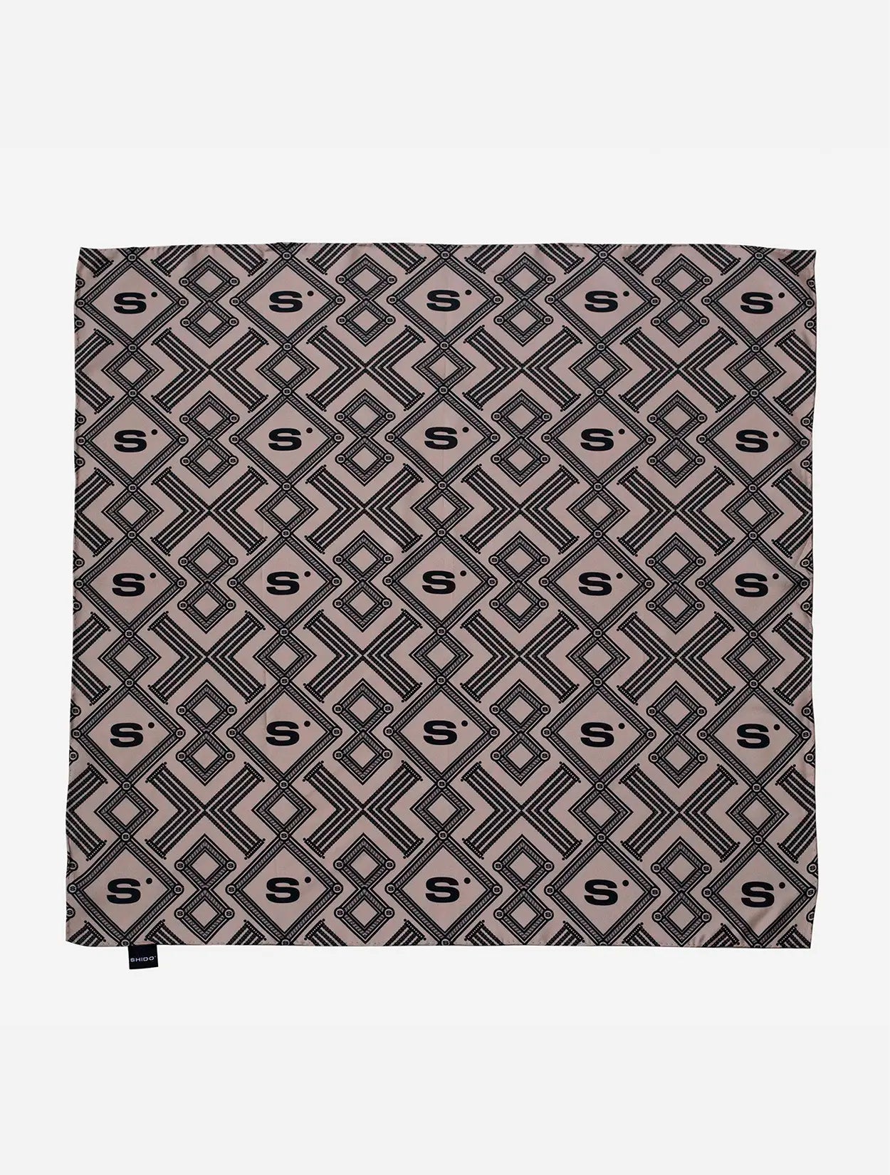 Pañoleta con un sofisticado patrón de monogramas en tonos champagne y negro, ideal para un estilo clásico y refinado.