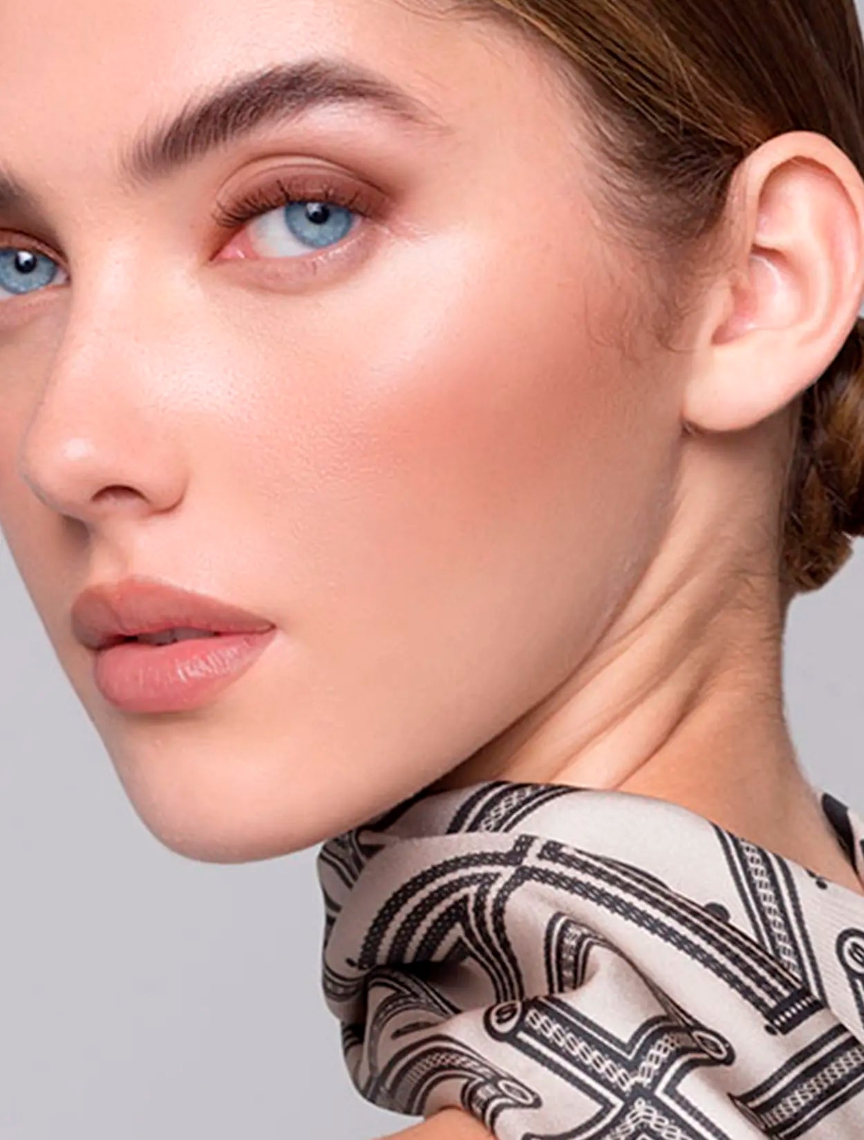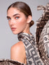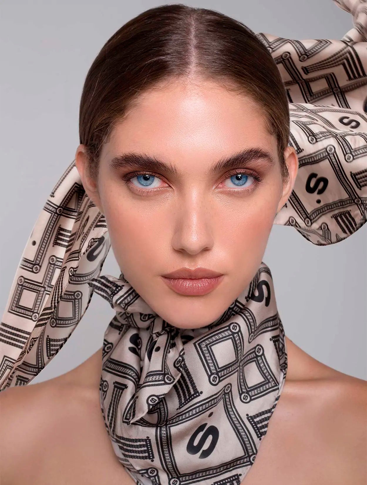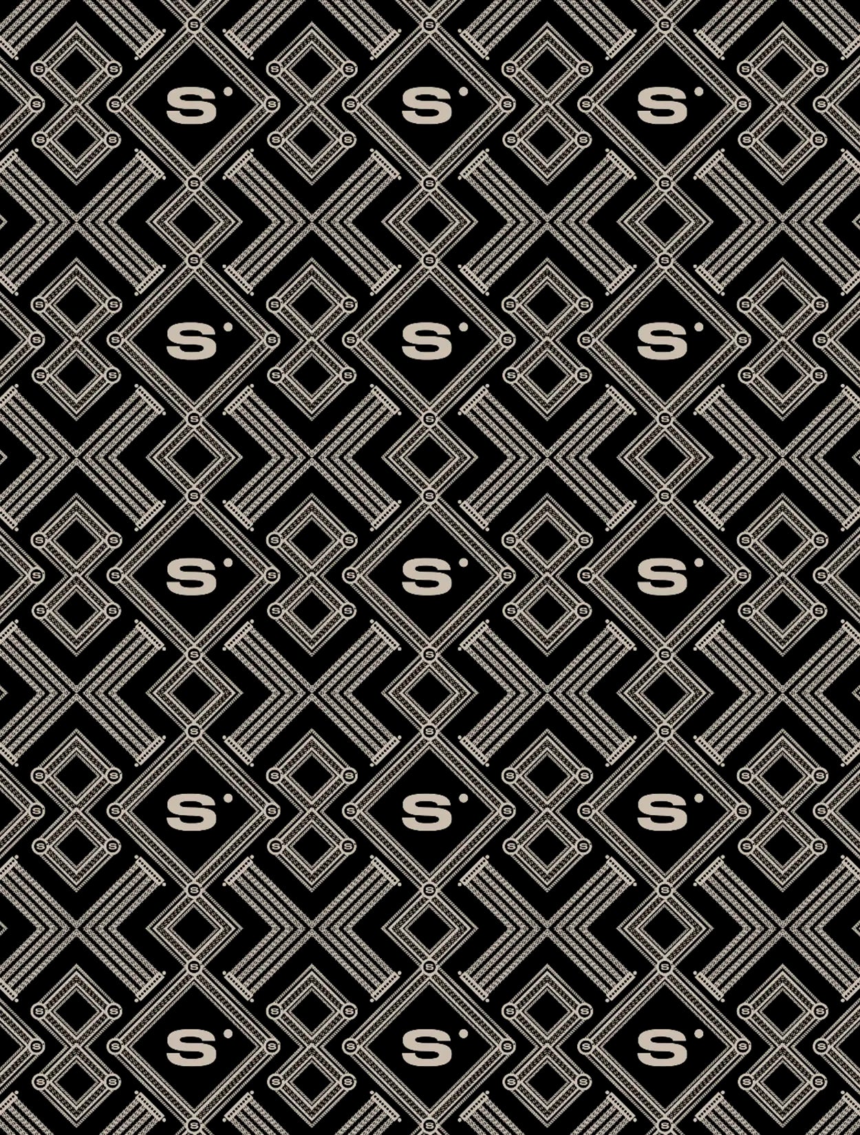 Pañoleta con un sofisticado patrón de monogramas en tonos champagne y negro, ideal para un estilo clásico y refinado.
