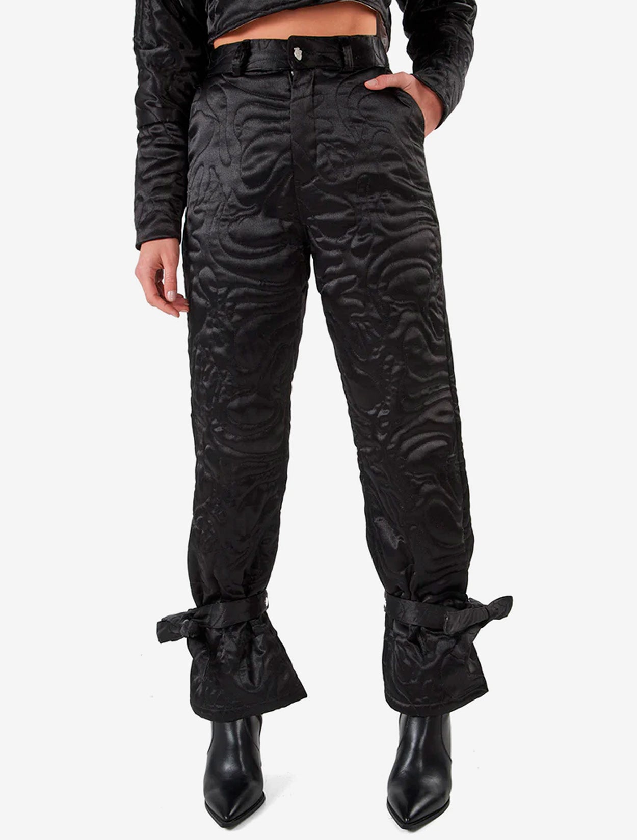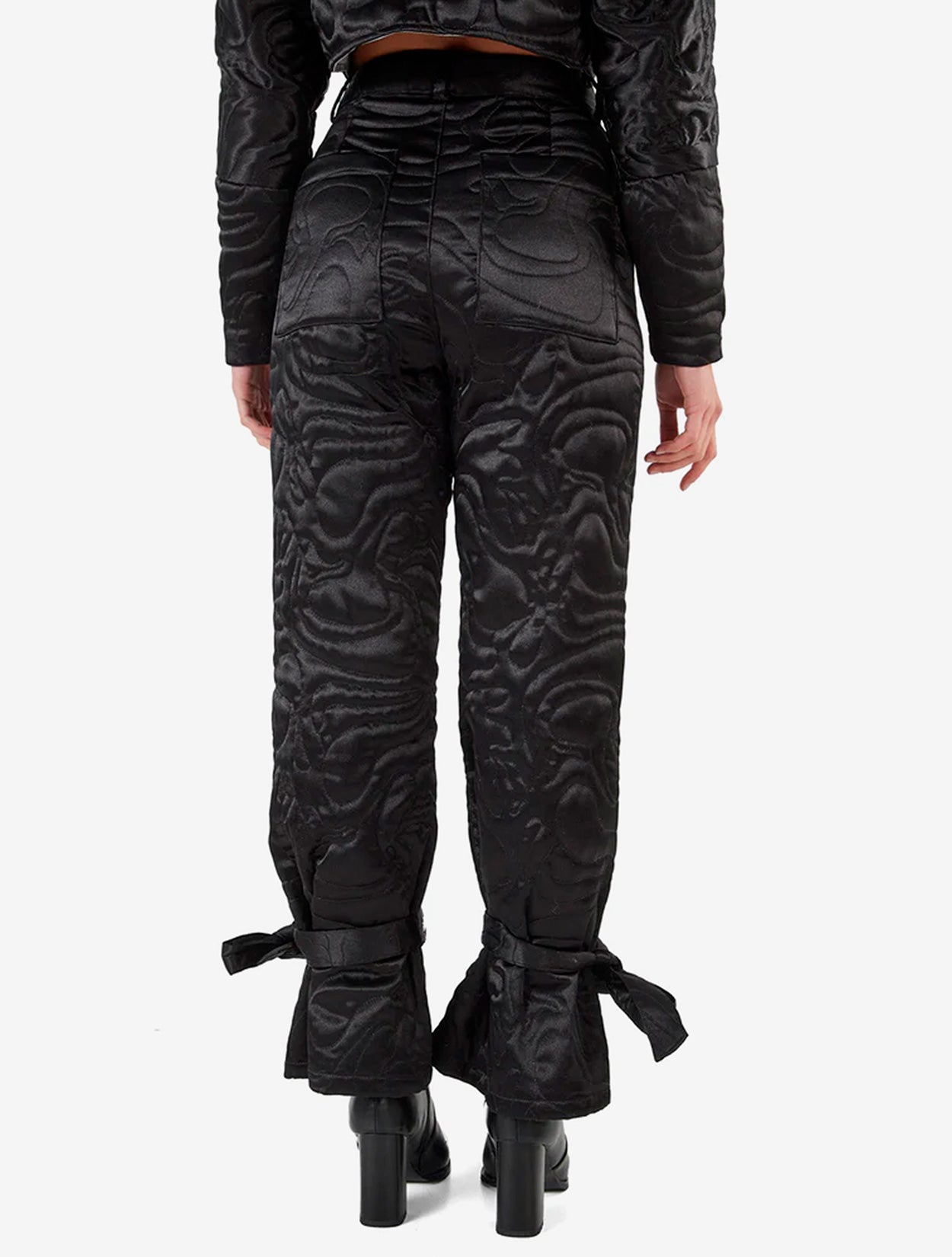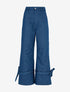 Pantalón de cintura alta que combina comodidad y vanguardia. Su corte relajado es acentuado por el detalle estrella: lazos ajustables en los tobillos, permitiéndote personalizar el ajuste y el flare.