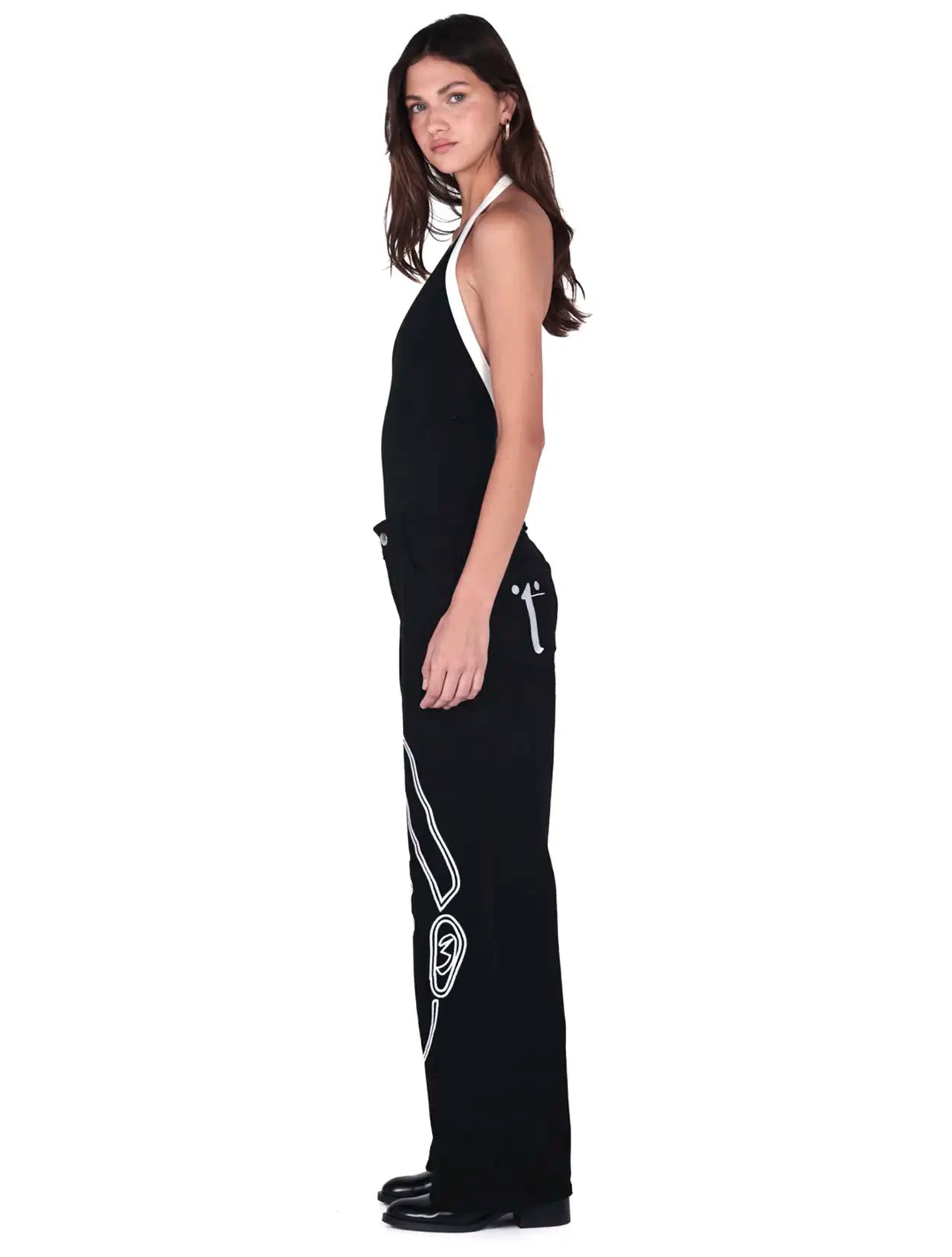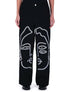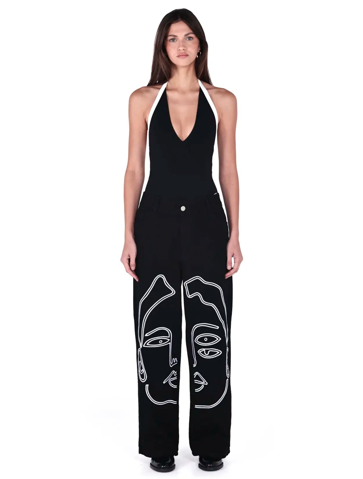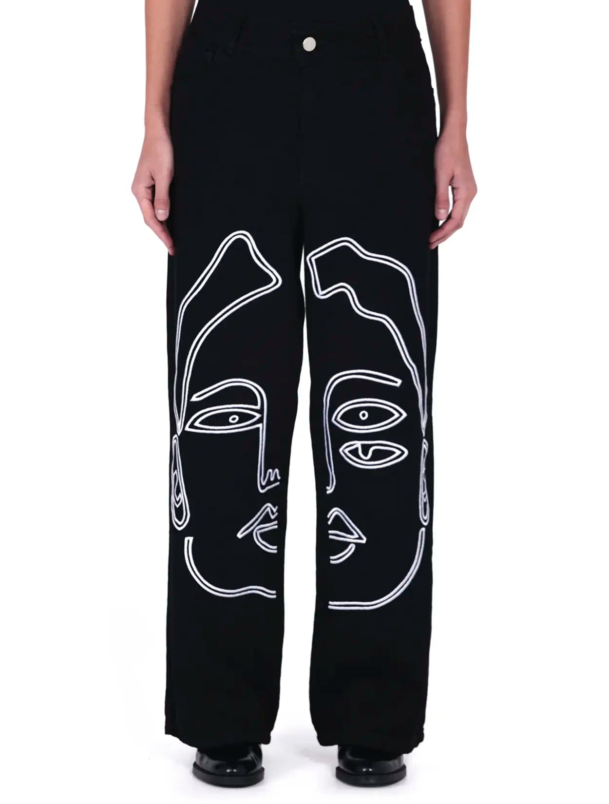 Pantalón Chava presenta un diseño de rostros abstractos en trazo blanco, finamente bordado para un alto contraste espectacular.