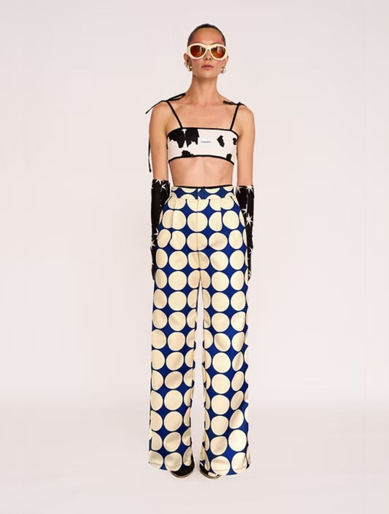 Pantalón recto de tiro alto con pernera ancha, confeccionado en dril de poliéster para mayor estructura y comodidad. El diseño presenta un atrevido estampado geométrico de círculos extragrandes en color marfil sobre un fondo azul intenso, creando un impactante contraste gráfico. Incluye bolsillos delanteros y traseros funcionales, y cierre frontal con cremallera y botón. Una prenda moderna y versátil que combina practicidad con un estilo audaz y contemporáneo. Esta prenda fue tejida, diseñada, ilustrada, confeccionada y empaquetada por manos colombianas especialmente para ti.