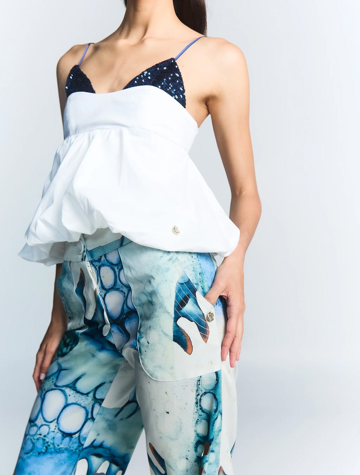 Nuestros brillantes estampados se basan en un proceso ecológico de sublimación por transferencia térmica sin agua ni productos químicos peligrosos, y en telas hechas de PET reciclado y botones o materiales hechos de cannabis reciclado.