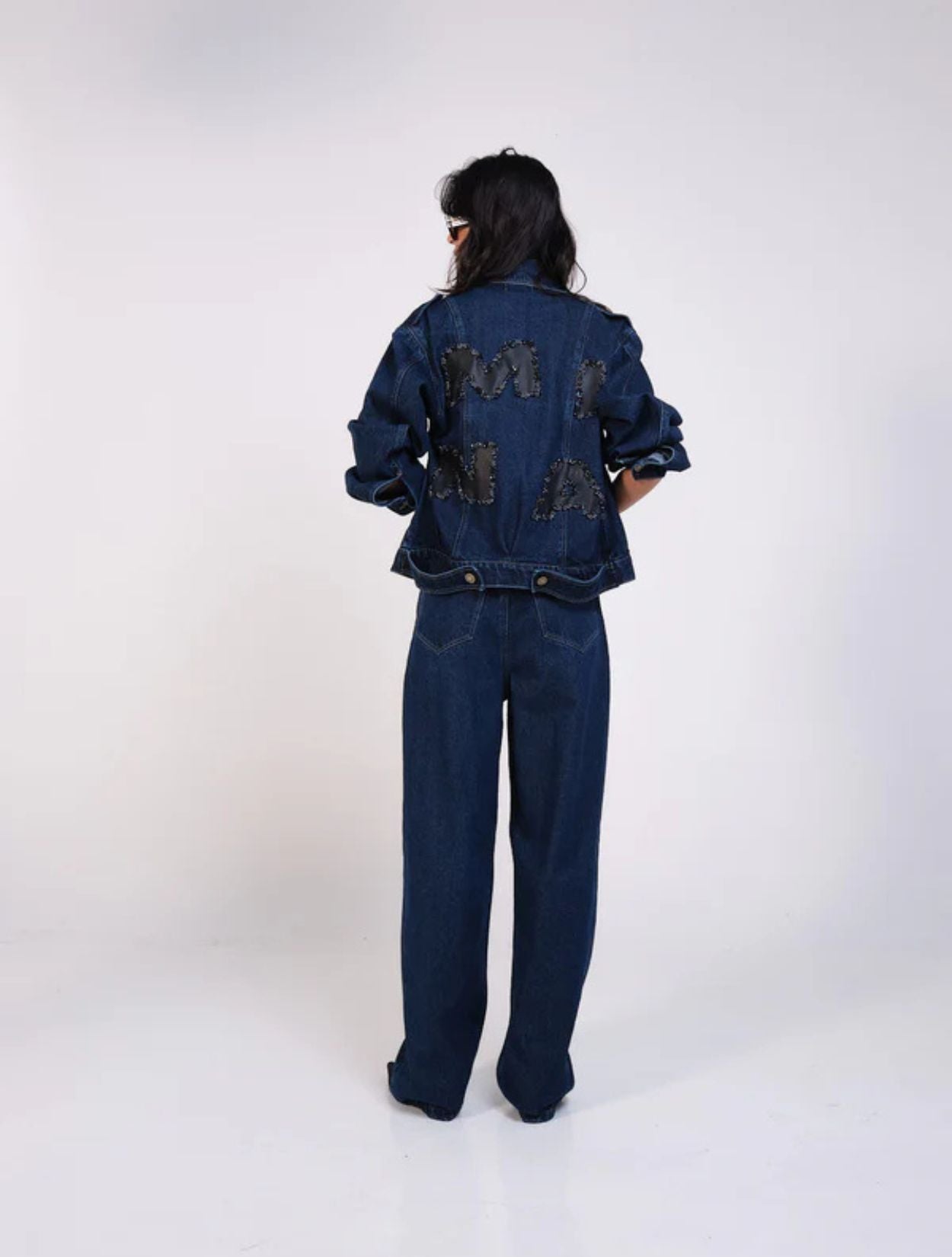 Pantalón en denim con pretina y pasadores, sistema de cierre frontal con cremallera y botón, bolsillos delanteros y de parche en la parte posterior del pantalón, con letras en cuerina bordadas en pedrería.