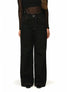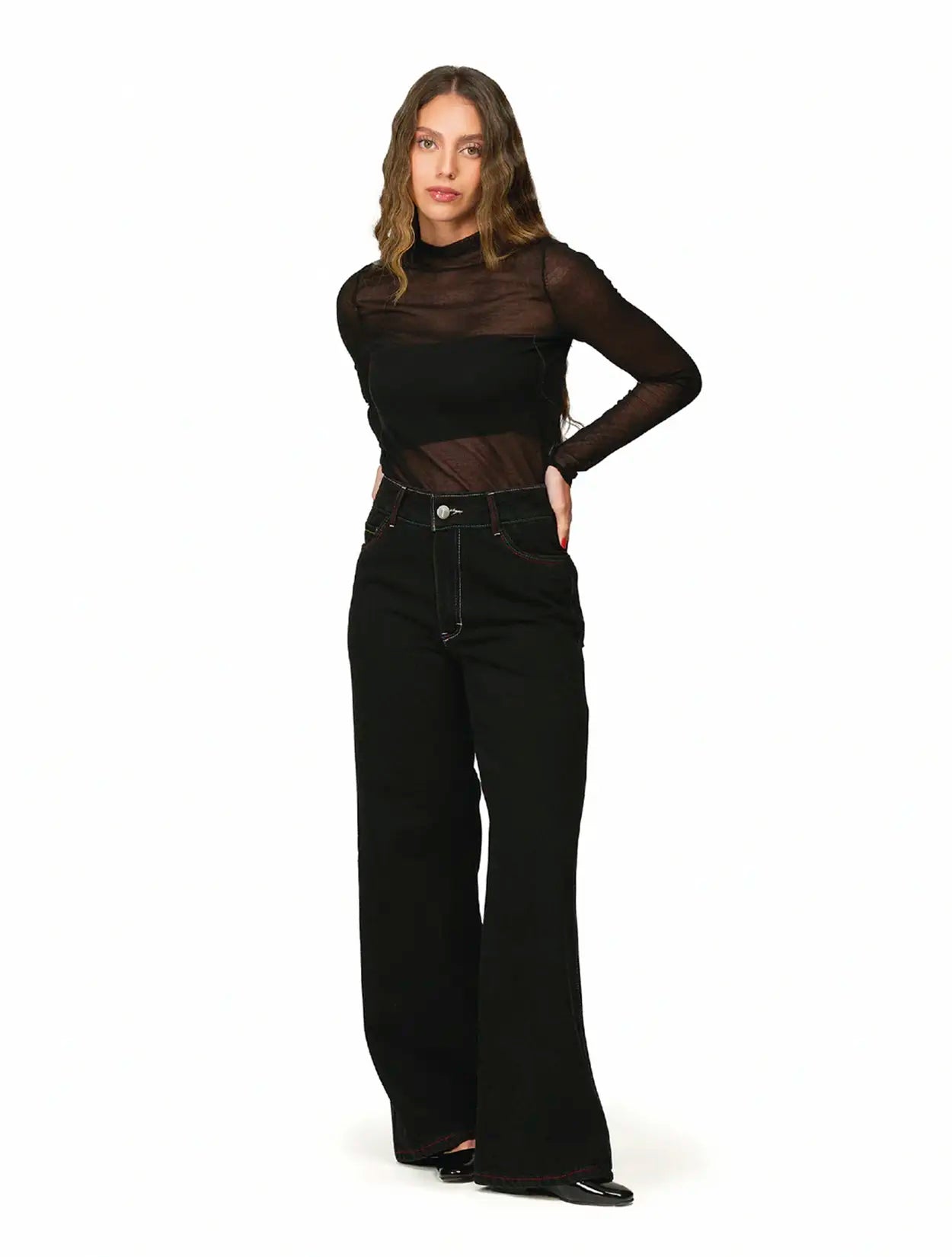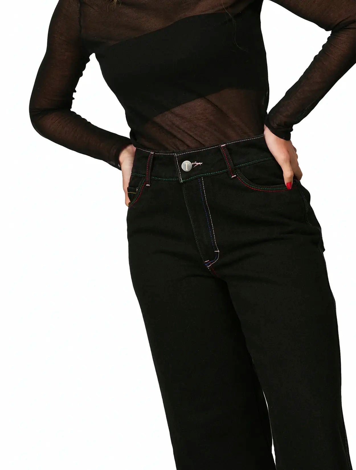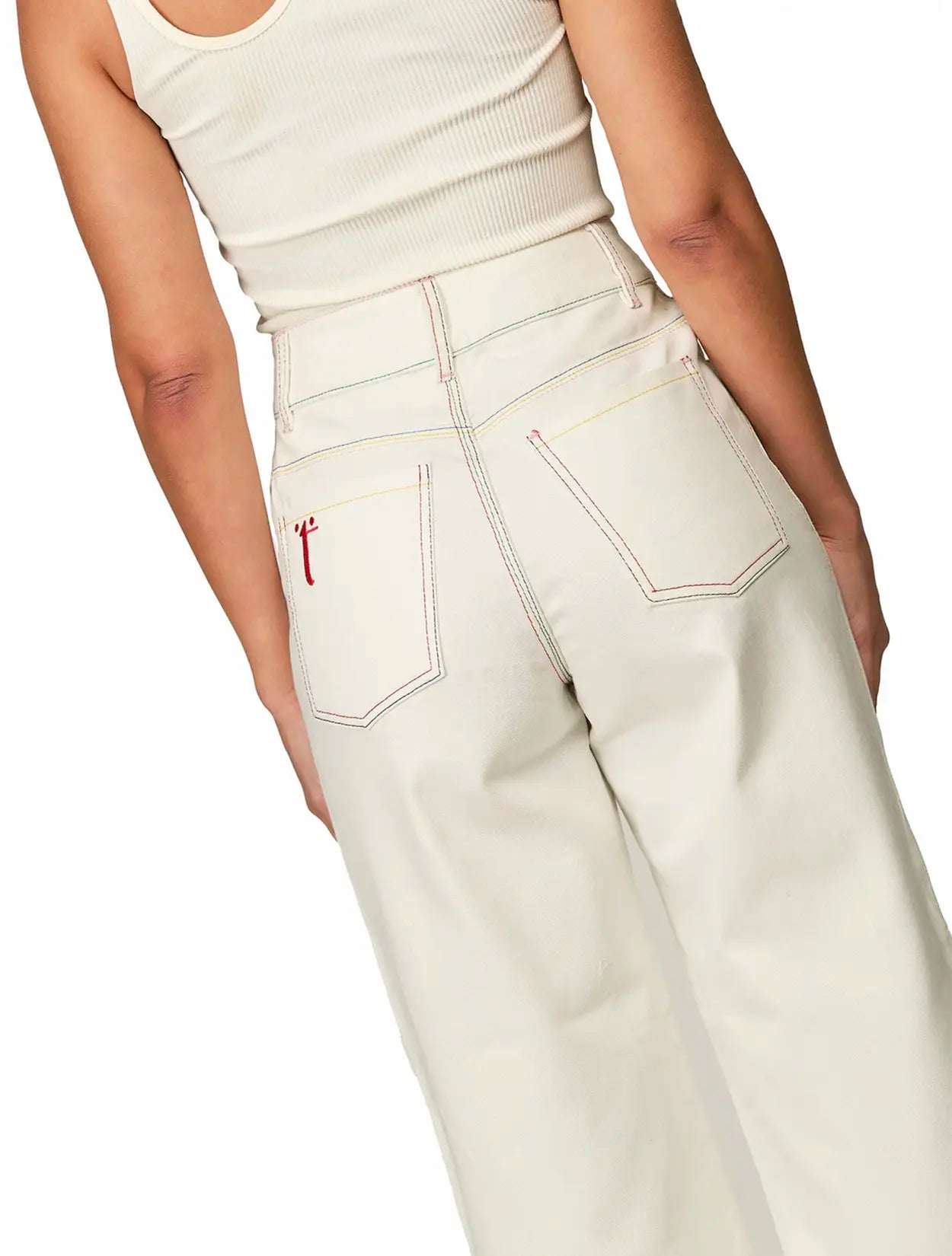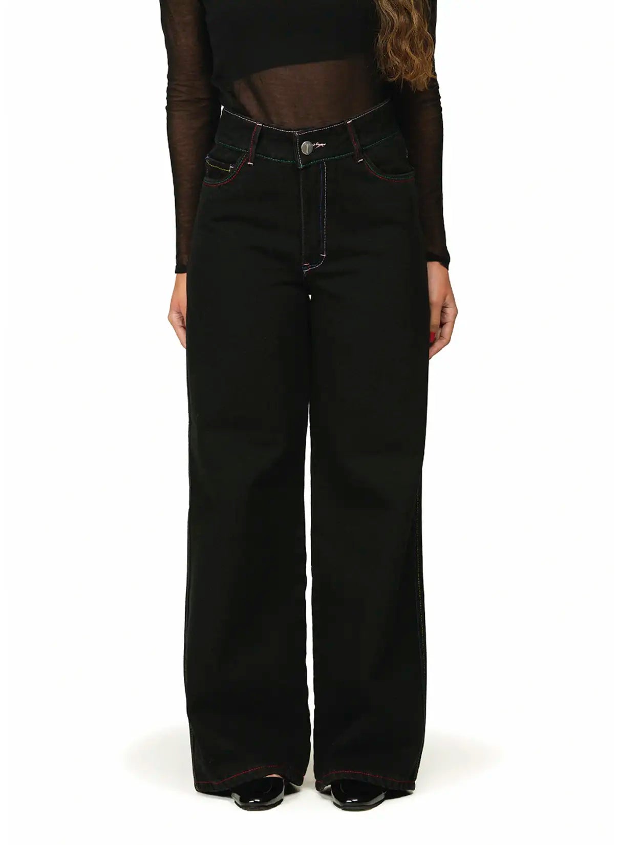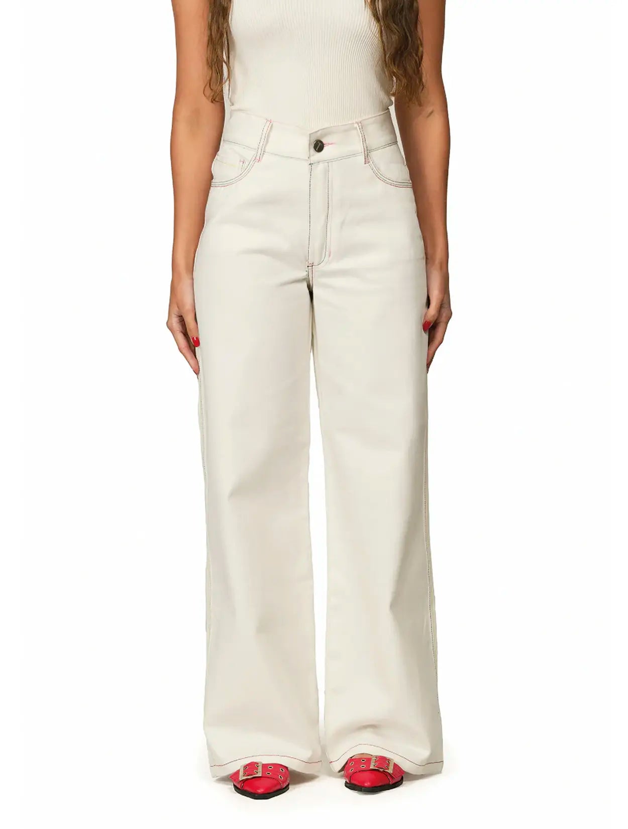 Pantalón de corte ancho y recto con un estilo clásico. Su diseño resalta por las costuras un contraste en color rojo o rosa pálido, que definen los bordes y los detalles.