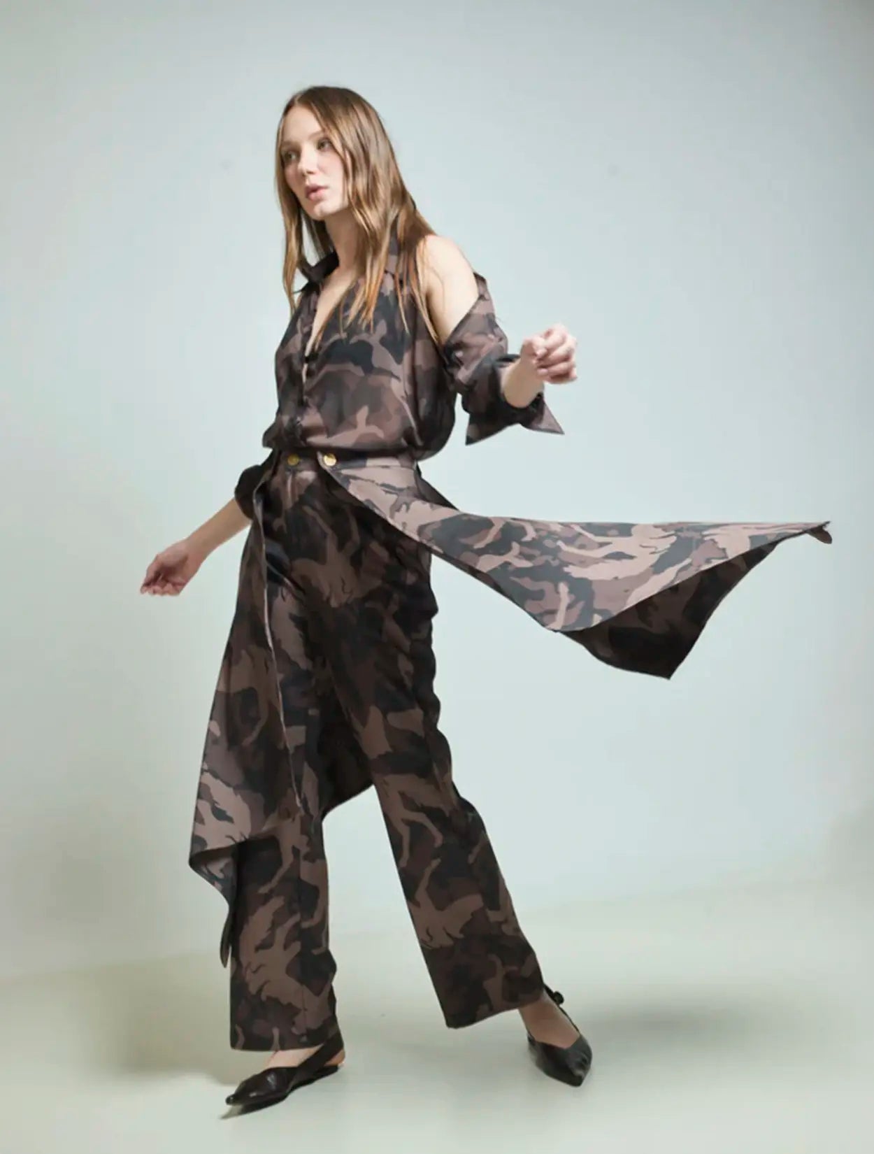 Pantalón liviano café con estampados de caballos con pretina, sistema de cierre frontal con cremallera y botón, bolsillos delanteros y de parche traseros con corbatas laterales removibles.