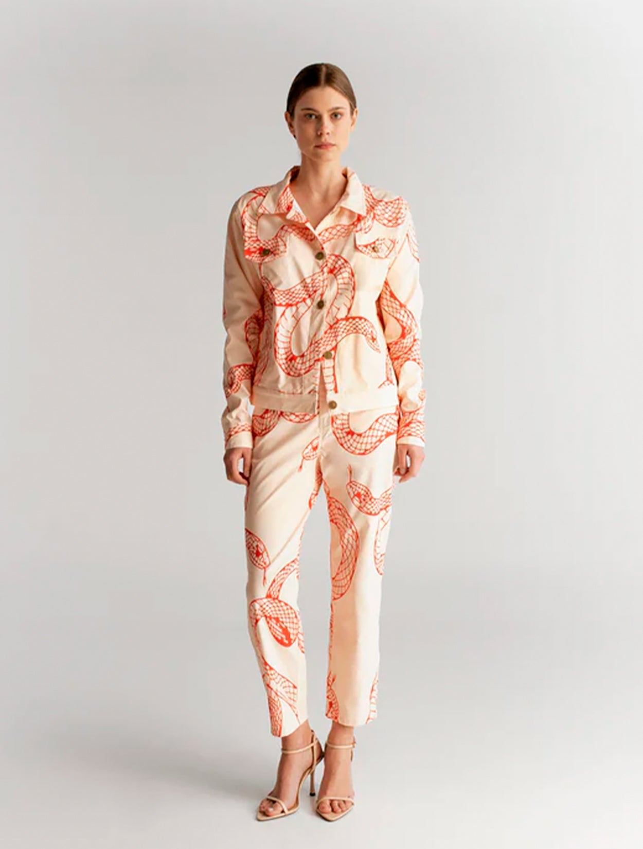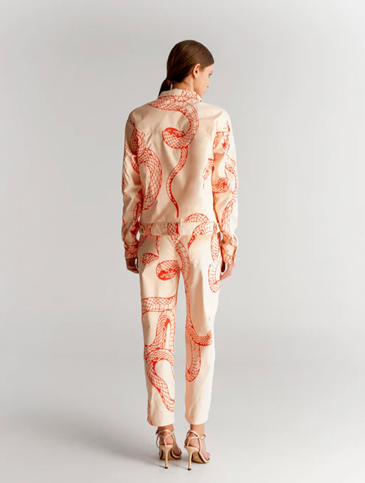 Pantalón de corte recto o ligeramente cónico (estrechado hacia el tobillo), que forma parte de un conjunto y destaca por su estampado integral de inspiración exótica.