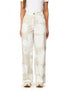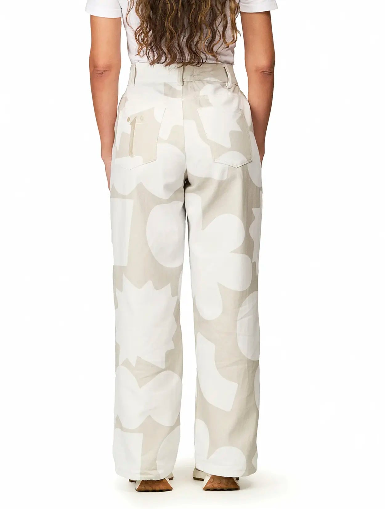 Pantalón de corte recto con un estampado integral de patrones orgánicos y formas abstractas en tonos neutros de beige y blanco roto. El diseño es sutil, pero de alto impacto visual.